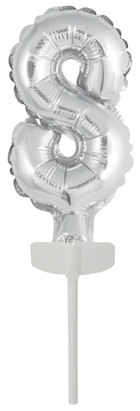 Hopeanvärinen folionumeropallo koristeeksi kakun päälle. Pallon koko 11 x 7 cm. Paketissa mukana pilli, jolla pallon voi täyttää ja toinen pilli, jolla koristeen voi laittaa pallon päälle.