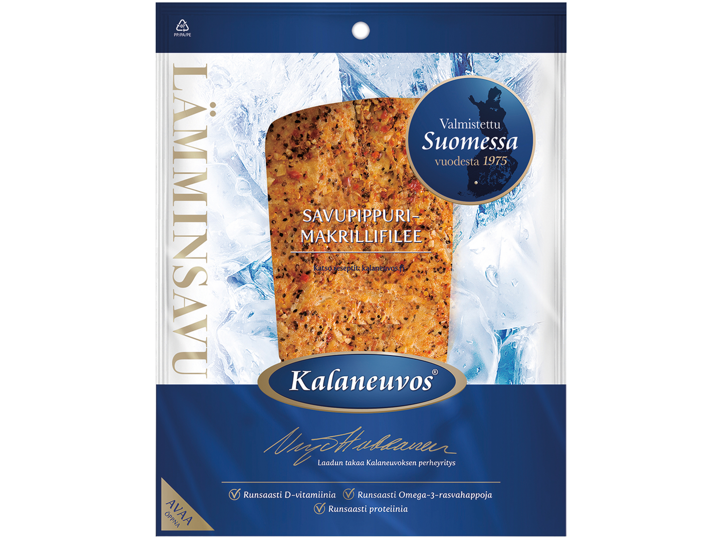 Kalaneuvoksen savupippurimakrillifilee on pippurilla sekä mm. etikalla, paprikalla ja sipulilla maustettu makrillifileeperhonen. Se on herkullinen sellaisenaan syötäväksi, salaatissa tai vaikkapa tahnana leivän päällä. Myös noutopöytiin se tuo hyvää vaihtelua perinteisten kalojen rinnalle. Koska savupippurimakrillifilee on ruodoton, sitä on helppo käyttää ja sitä on turvallista tarjoilla myös lapsille. Ainoastaan kalan nahka on poistettava ennen ruoan valmistusta tai tuotteen syömistä sellaisenaan. Yksittäisen tuotteen keskimääräinen paino on 240 g.
