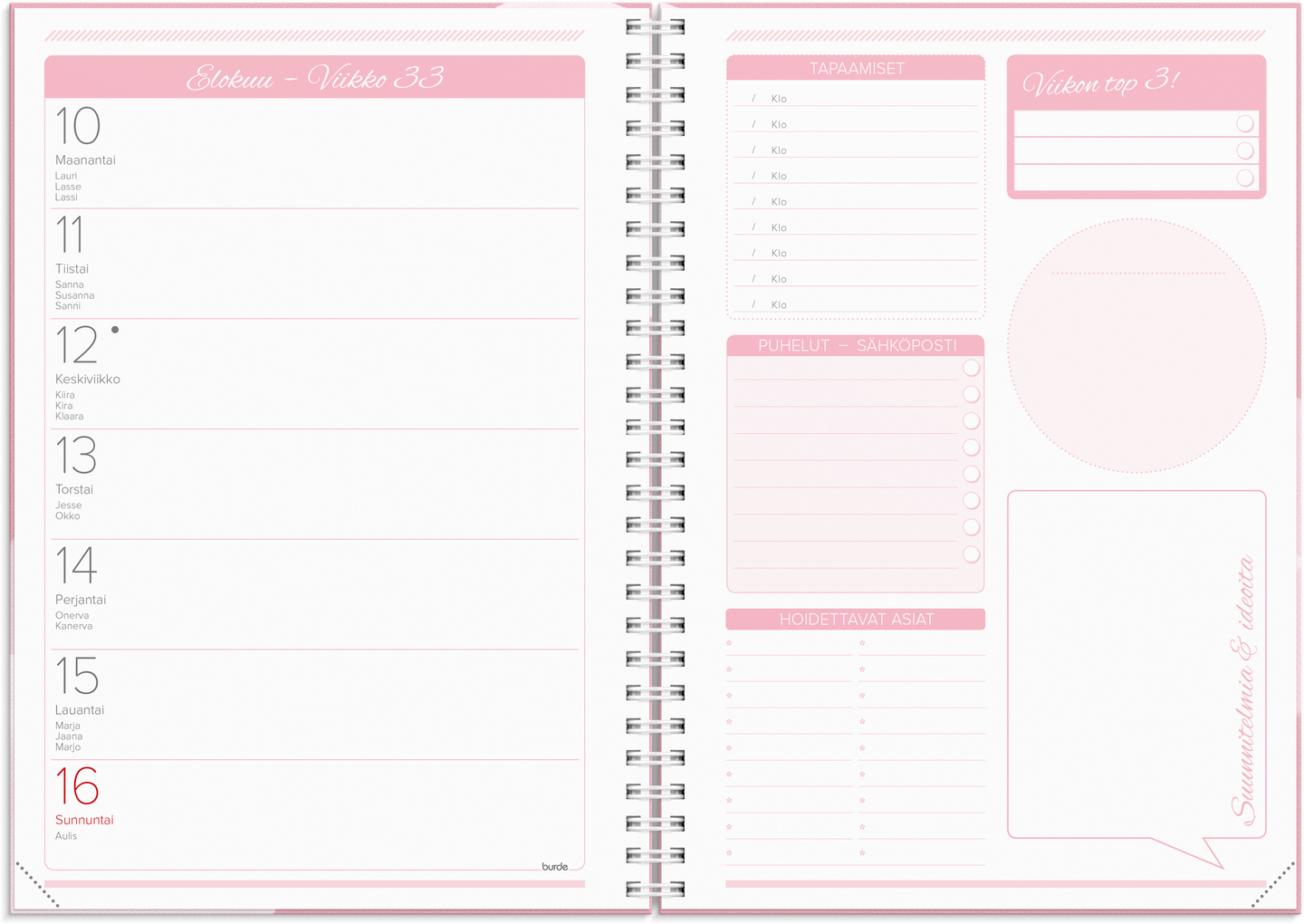Kun sinulla tapahtuu paljon asioita samanaikaisesti, on helppo unohtaavosa niistä! Kalenteri Make It Happen, auttaa sinua järjestelemään arkeasi ja olemaan tehokas jokapäiväisessä elämässä niin, että sinun ei tarvitse muistaa kaikkea. Jokaisella aukeamalla löytyy listoja, joiden avulla voit suunnitella esimerkiksi ostoksesi, tapaamiset sekä hoidettavat asiat. Kartonkikansi, kuminauhalla. Paperitasku. Kalenterin aukeamalla yksi viikko ja muistilistat. Kalenteri sisältää nimipäivät, juhlapyhät, liputuspäivät, kuun vaiheet, vuosisuunnitelmat kuluvalle vuodelle ja seuraavalle vuodelle, yleiset pyhäpäivät maailmalla, kalendaariset tiedot, auringon nousu- ja laskuajat ja muistiinpanosivut. Kalenteriosa: vk 51 2025-vk 53 2026/2027. Suomenkielinen. Parikierresidottu. FSC®. Koko: 148x210 mm (A5).