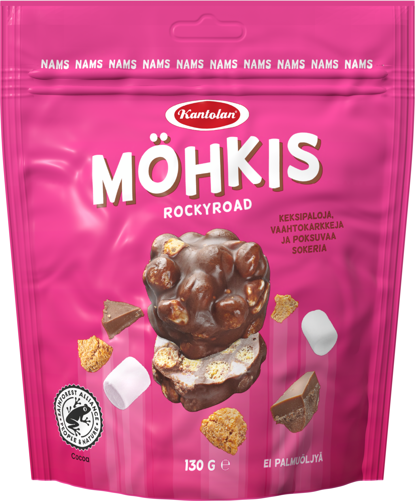 Mukavasti suussa sulava ja poksuva Möhkis saa sinut napostelemaan yhden sijasta toisenkin palan. Tämä herkullinen suklaakimpale kääri sisäänsä rapeita keksipaloja, pehmeitä vaahtokarkkeja sekä poksuvaa sokeria! Nam! Palmuöljytön.