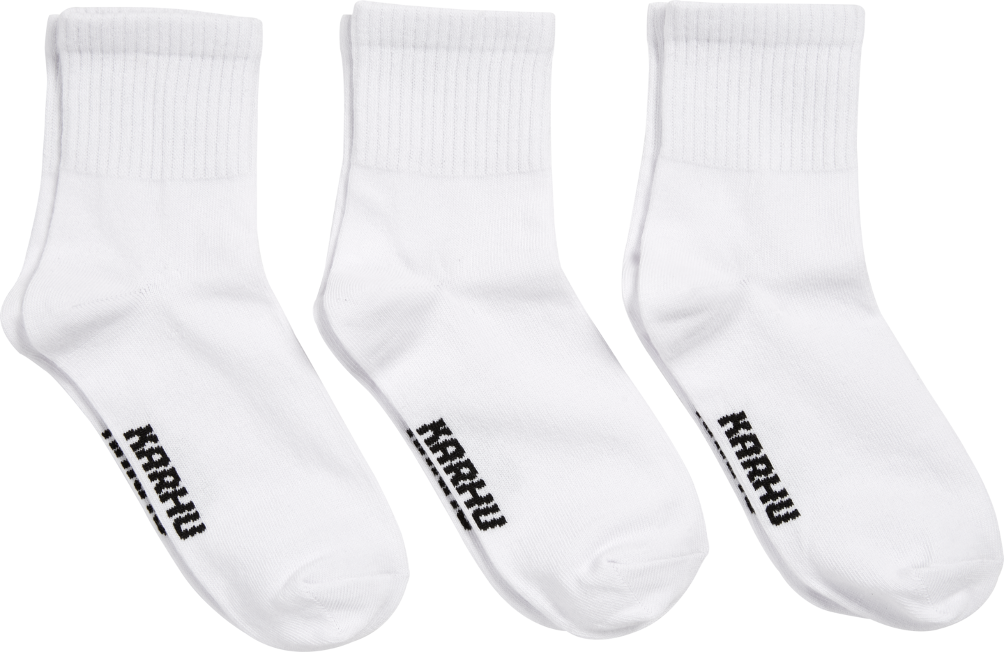Karhu urheilusukat unisex malli. Valkoinen yksivärinen sukka ja suuri musta Karhu-teksti jalkapohjan kohdalla.
