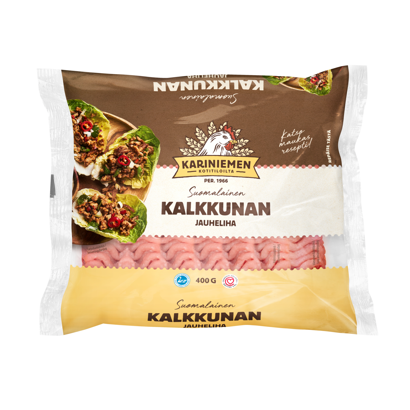 Kariniemen kalkkunan jauheliha kätevässä pussipakkauksessa. Kalkkunan jauheliha on vähärasvainen vaihtoehto monenlaiseen ruoanlaittoon. Kalkkunan jauheliha sopii hyvin pyöryköihin, pihveihin ja erilaisiin laatikoihin ja täytteeksi vaikka tortilloihin tai pizzaan. Eri tavoin maustamalla saat helposti maistuvia aterioita. Kariniemen kalkkuna on aina suomalaista.