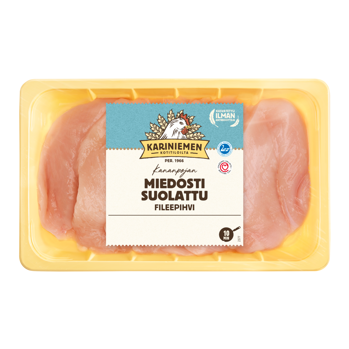 Kariniemen Kananpojan fileepihvi miedosti suolattu on helppo maustaa oman maun mukaan. Mieto suolaus pitää pihvin mehevämpänä. Fileepihvi kypsyy nopeasti pannulla, uunissa ja sopii erinomaisesti myös grillattavaksi. Rasiassa 5-8 pihviä. Kariniemen Kananpoika on aina suomalaista, ilman antibiootteja kasvatettua kanaa.
