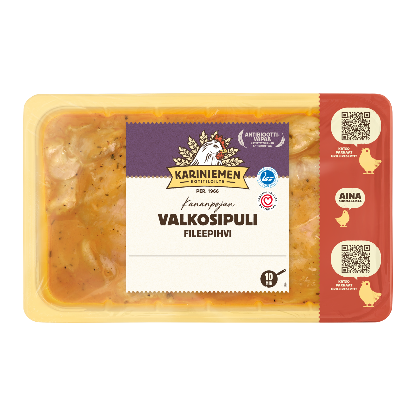 Kariniemen Kananpojan fileepihvi lempeällä valkosipulilla maustettuna. Fileepihvi kypsyy nopeasti pannulla, uunissa ja sopii erinomaisesti myös grillattavaksi. Rasiassa 5-8 pihviä. Kariniemen Kananpoika on aina suomalaista, ilman antibiootteja kasvatettua kanaa.