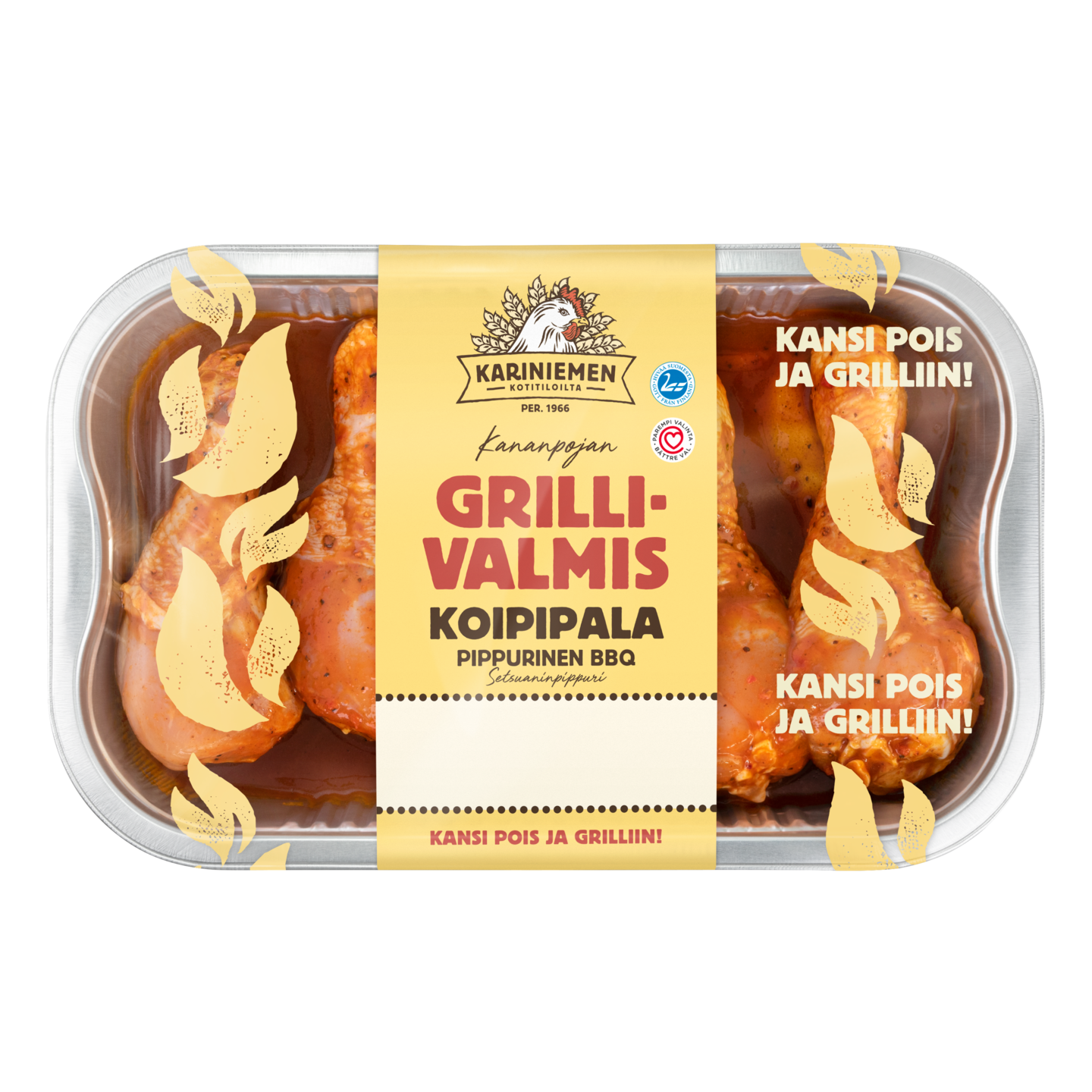 Kansi pois ja grilliin! Kariniemen Kananpojan Gillivalmis koipipala pippurinen BBQ on maistuva ratkaisu helppoon, onnistuneeseen grillaamiseen. Valmiiksi maustetut koipipalat voi grillata alumiinirasiassaan ja grilli pysyy puhtaana. Koipipalojen maukkaassa BBQ mausteessa setsuaninpippuri tuo aasialaista tvistiä tuttuun koipipalaan. Kariniemen Kananpoika on aina suomalaista, ilman antibiootteja kasvatettua kanaa.