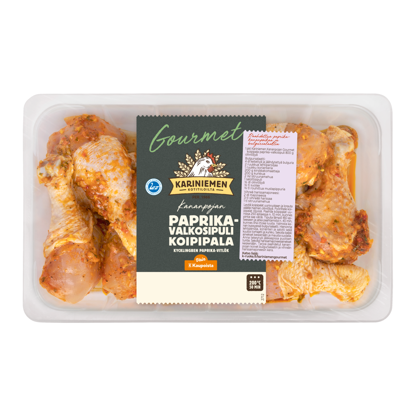 Kariniemen Gourmet Kananpojan koipipala paprika-valkosipuli on maustettu rouhean täyteläisellä pintamausteella. Koipipalat voi kypsentää rapean herkullisiksi uunissa tai air fryerilla. Kariniemen Kananpoika on aina suomalaista, antibiootitonta kanaa.