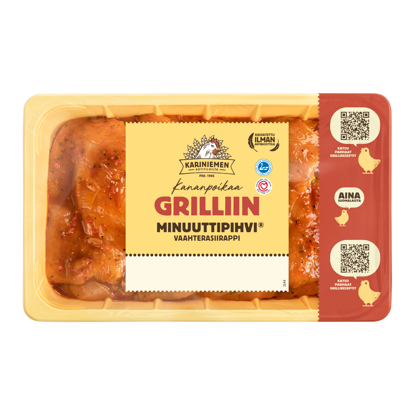 Kariniemen Kananpojan Minuuttipihvi Vaahterasiirappi on ohut, fileestä valmistettu pihvi. Minuuttipihvi sopii moniin nopeisiin kanaruokiin, esimerkiksi pasta-annoksiin, salaatteihin ja se on herkullinen myös grillattuna. Rasiassa on 5-7 pihviä. Kariniemen Kananpoika on aina suomalaista, ilman antibiootteja kasvatettua kanaa.