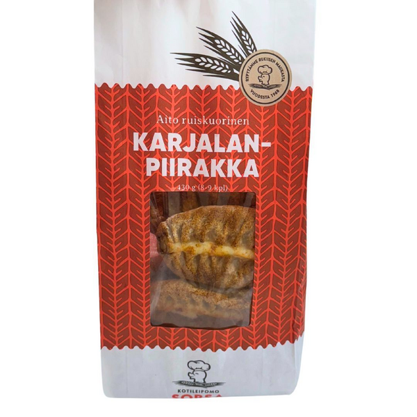 Ruiskuoreen leivottuja perinteisiä karjalanpiirakoita riisitäytteellä.