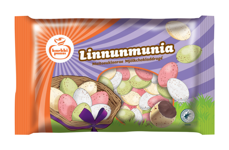 Söpöt Karkkipussin Linnunmunat ovat maukkaita rapealla sokerikuorrutteella kuorrutettuja maitosuklaamunia jotka sopivat vaikka keväisen kakun koristeeksi.