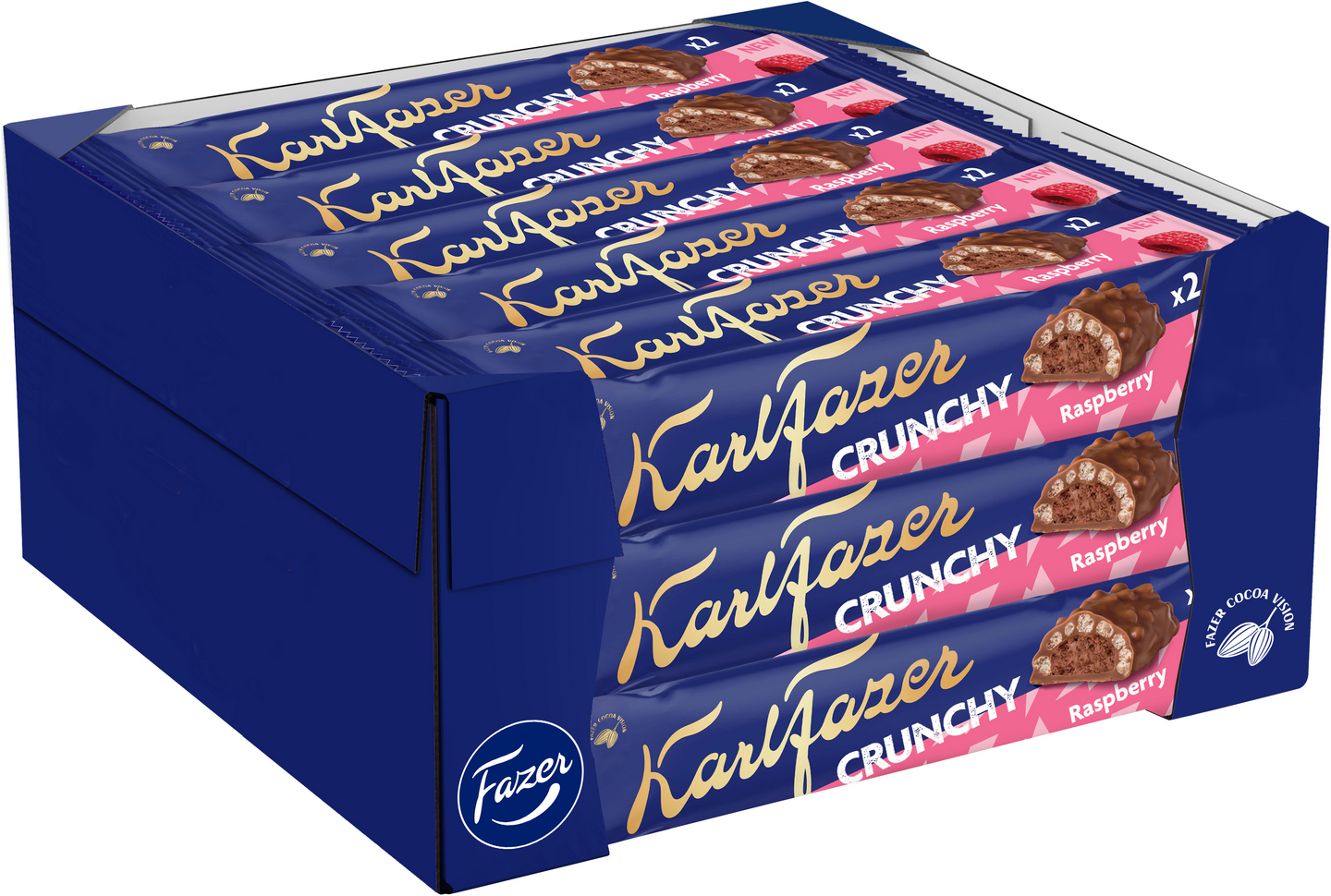 Suomen rakastetuin suklaa, jonka ainutlaatuisen täyteläisen maun ovat taanneet parhaat raaka-aineet jo vuodesta 1922 saakka. Karl Fazer Crunchy Raspberry -suklaapatukassa maistuu raikas vadelmanmakuinen tryffelitäyte. Patukka on kuorrutettu rapeilla riisimuroilla ja herkullinen Fazer maitosuklaalla - täydellinen yhdistelmä rouskuvaa energiaa ja suklaista nautintoa, joka taltuttaa isommankin makean nälän. Pakkauksessa on kaksi isoa palaa. Maista, ihastu ja nauti! Noudatamme kaakaonhankinnassamme Fazerin kaakaovisiota. Lue lisää www.fazercocoavision.com.