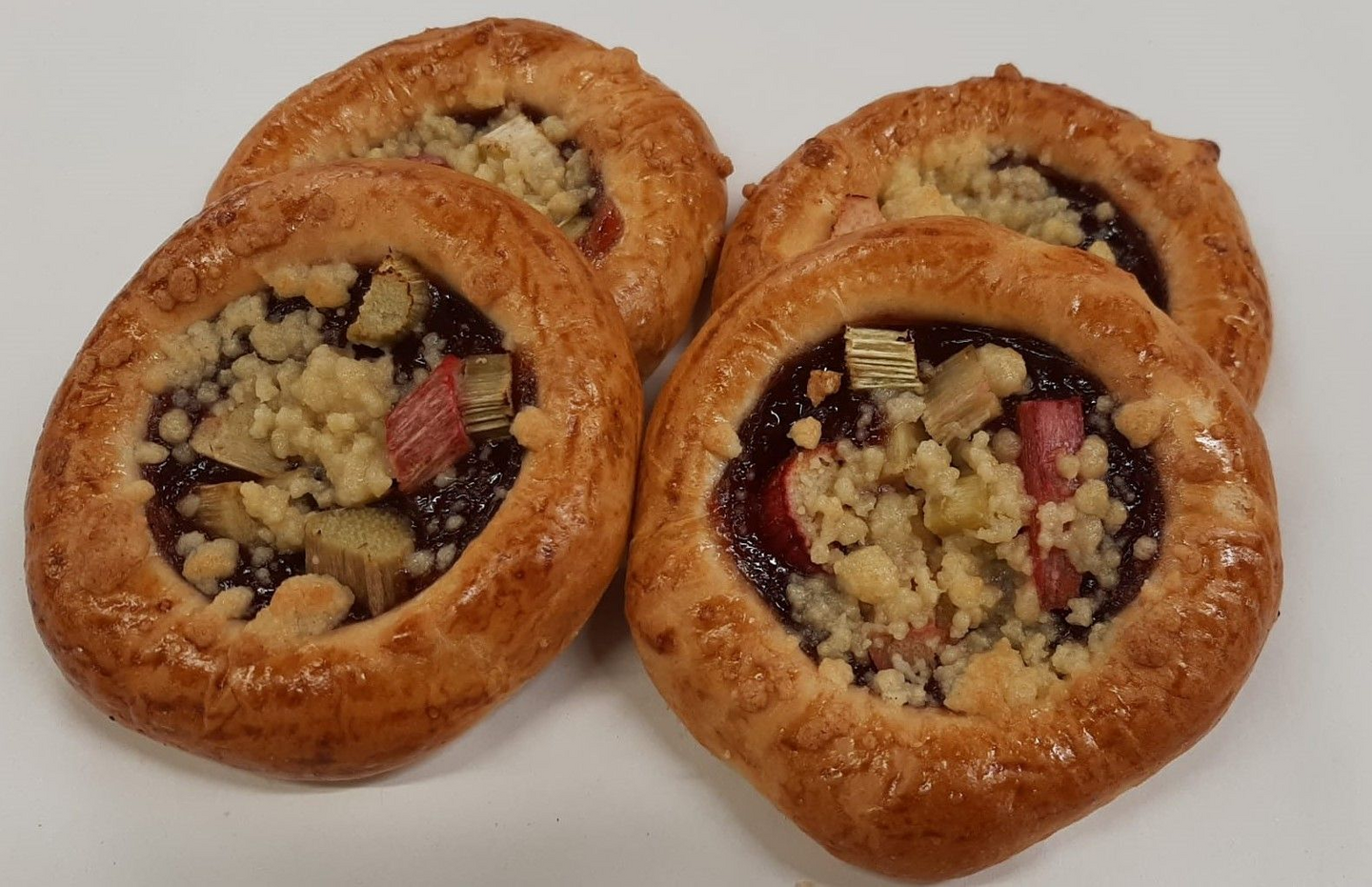 Voilla leivottu pulla, mansikkahillo ja Raparperipala täytteellä.
