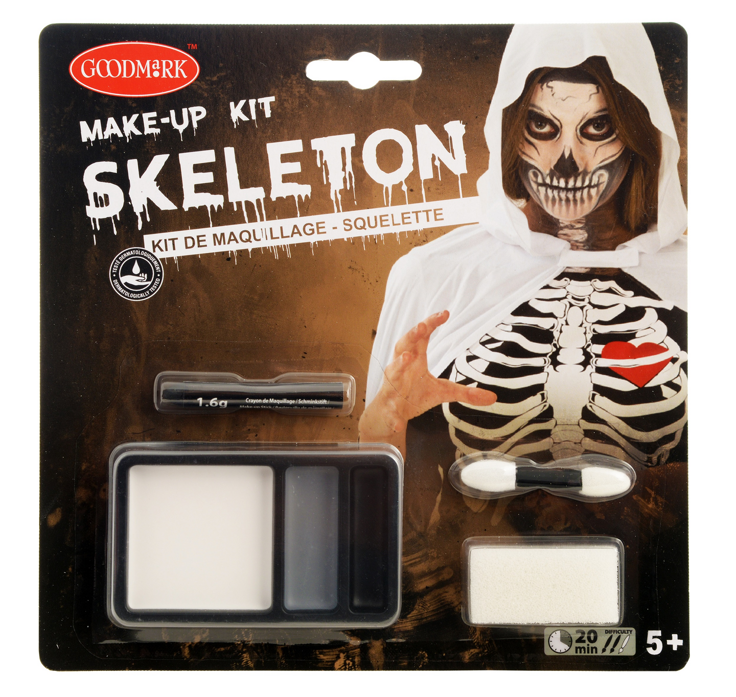 Kasvovärisetti luuranko sisältää meikkisienen, kaksipuoleisen applikaattorin, mustan kasvovärikynän 1,6g sekä öljypohjaiset kasvovärit valkoinen 7g, harmaa 2g ja musta 1g.