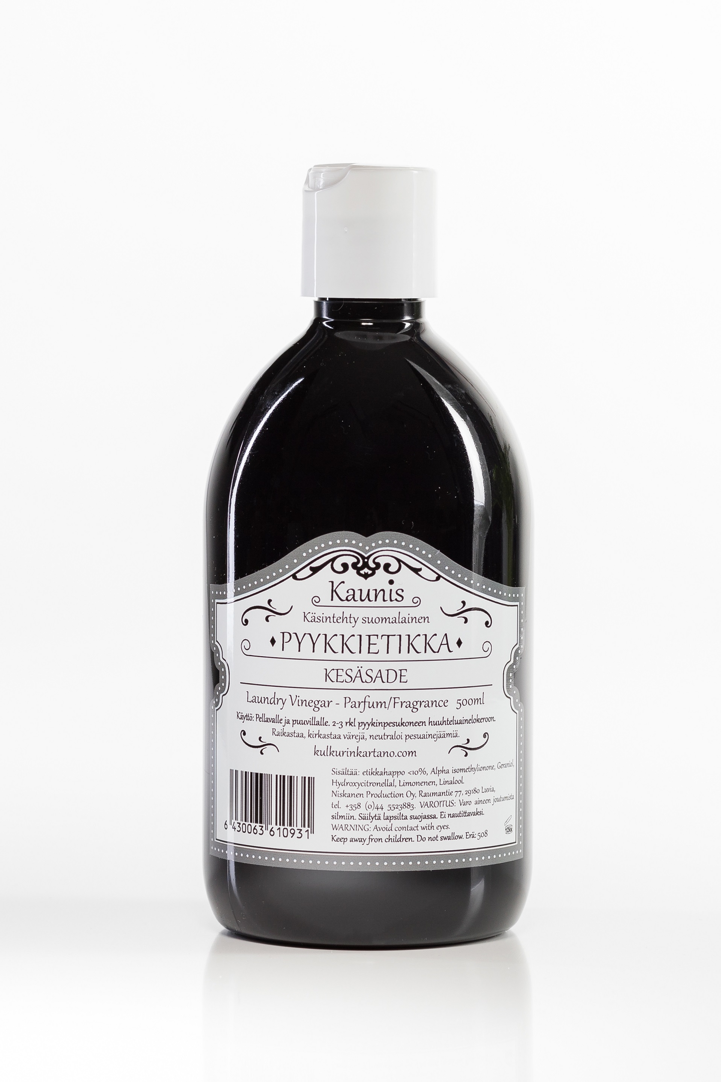 Kaunis pyykkietikoiden pohjana on luonnollinen Rajamäen väkiviinaetikka. Pyykkietikoiden tuoksut ovat parfyymituoksuja, joita käytetään myös iholle jätettävässä kosmetiikassa kuten voiteissa ja ovat siksi turvallisia iholle. Pyykinhuuhteluaineena pyykkietikka raikastaa, kirkastaa värejä, vähentää nukkaantumista ja neutraloi pesuainejäämiä tekstiileistä ja pyykinpesukoneesta. Kaunis pyykkietikka soveltuu myös pyykin liotukseen 1dl/5l vettä. Pyykinpesukoneen raikastukseen: 1-2dl pyykkietikkaa pesuainelokeroon ja pese tyhjä kone kuumalla ohjelmalla. Huuhtele kone vielä huuhteluohjelmalla. Siivoukseen 0,5dl/1,5l vettä. Kylpyhuoneen kalkinpoistoon ja ikkunoiden pesuun puolet pyykkietikka ja puolet vettä. Kastele kaakelien saumakohdat aluksi vedellä ja huuhtele lopuksi huolellisesti etteivät saumat haurastu. Älä käytä alumiinille, marmorille tai emalille. Kun Kaunis pyykkietikkapullo on tyhjä, lisää siihen vettä ja saat tuoksuvan silitysveden. Ekologinen, vegan.
