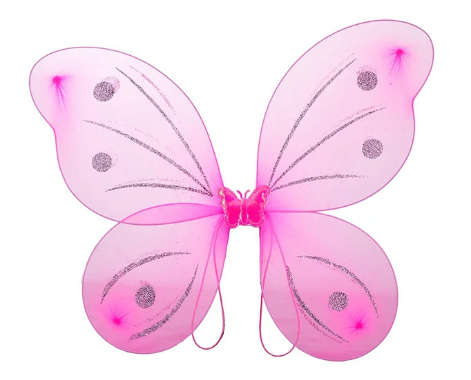 Vaaleanpunaiset keijun siivet kiiinnitetään kuminauhojen avulla. Siipien koko on 48 x 38 cm.