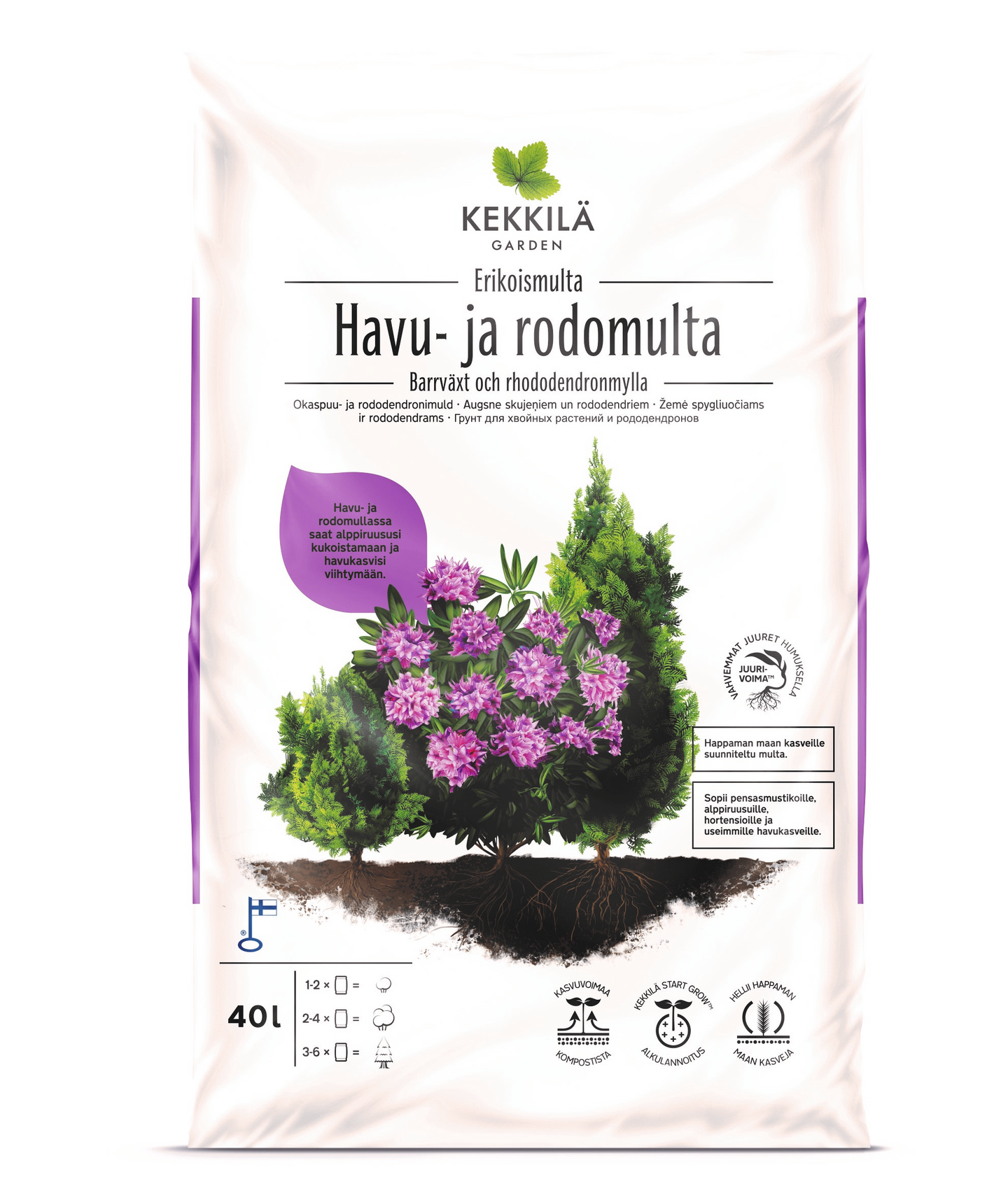 Kekkilä Havu- ja rodomulta on korkealaatuinen ja käyttövalmis multa hapanta maata suosivien kasvien tarpeisiin.