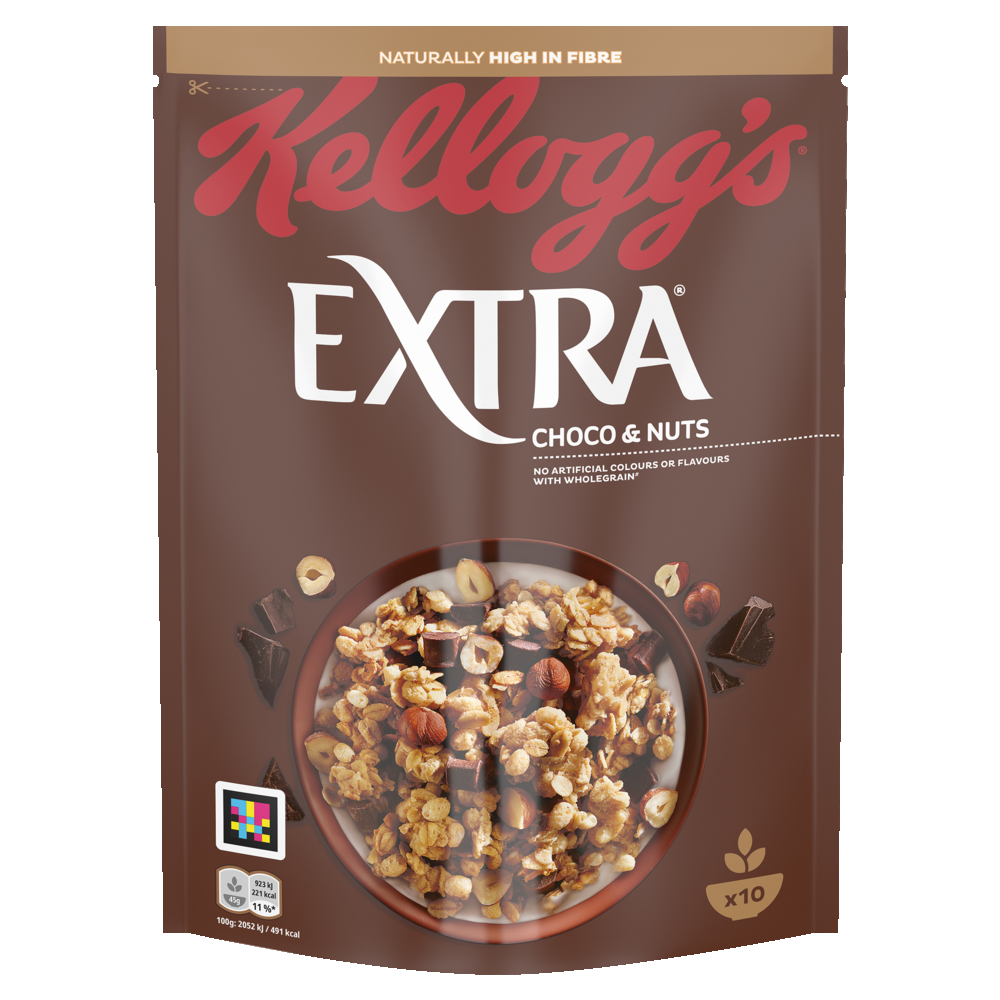 Aloita päiväsi täydellisellä aamiaisella Kellogg's Extra Choco and Nuts -granolalla. Tämä herkullinen granola yhdistää rapeaksi paistetut täysjyväkaurahiutaleet, pehmeän tumman suklaan sekä pähkinät, luoden makuelämyksen, joka vie kielen mennessään. Ei keinotekoisia värejä tai makeutusaineita – vain aito ja täyteläinen maku, joka sopii täydellisesti niin rauhallisiin aamuhetkiin kuin kiireisiin päiviin. Nauti granolasta aamukahvin tai jogurtin kanssa, tai herkuttele suoraan pussista.