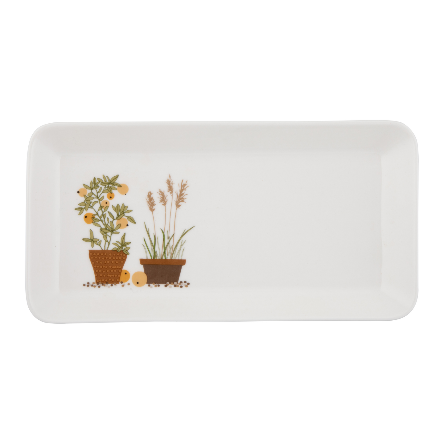 Suorakaiteen muotoinen, keraaminen tarjotin keittiöön, kotiin ja puutarhaan. Suola- ja pippurimyllyjen alukseksi, tarjoiluastiaksi, kukka- tai yrttiruukun alle, tästä tuotteesta on moneen eri käyttötarkoitukseen. Uunin, mikron ja konepesun kestävä.