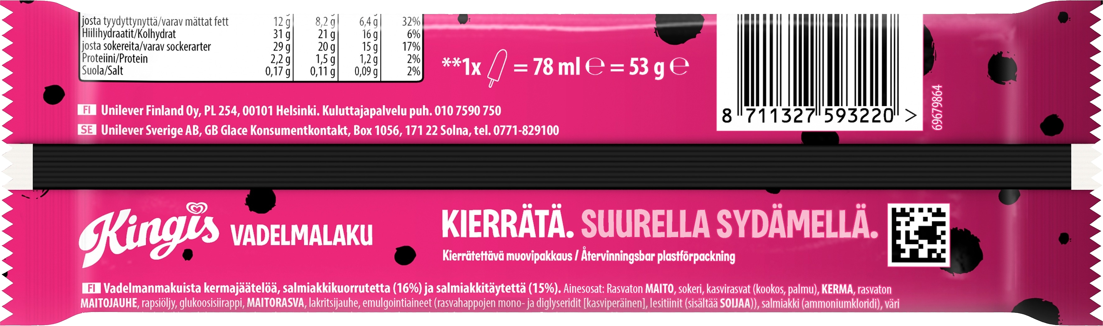 Kingis - suurella sydämellä. Rakastettu klassikkojäätelö Kingis on hurmannut jo yli 40-vuotta suomalaisia jäätelönsyöjiä suurella sydämellä. Kingis Original -jäätelöpuikko on takuuvarma valinta vuodesta toiseen ja lisäksi Kingis -jäätelöiden vaihtuvat uutuusmaut hurmaavat herkullisuudellaan. Puikkojäätelöiden lisäksi Kingis on laajentunut uusiin tuotemuotoihin ja voit nyt herkutella puikkojäätelön lisäksi Kingis-keksijäätelöllä ja jälkiruokajäätelöllä. Kingiksellä on suuri sydän ja pilke silmäkulmassa ja se haluaa kannustaa kaikkia suurisydämisiin tekoihin. Kingis on tehnyt useana vuonna yhteistyötä Pelastakaa Lapset ry:n kanssa ja vuonna 2022 Kingis on yksi Mielinauha -keräyksen pääyhteistyökumppaneista.