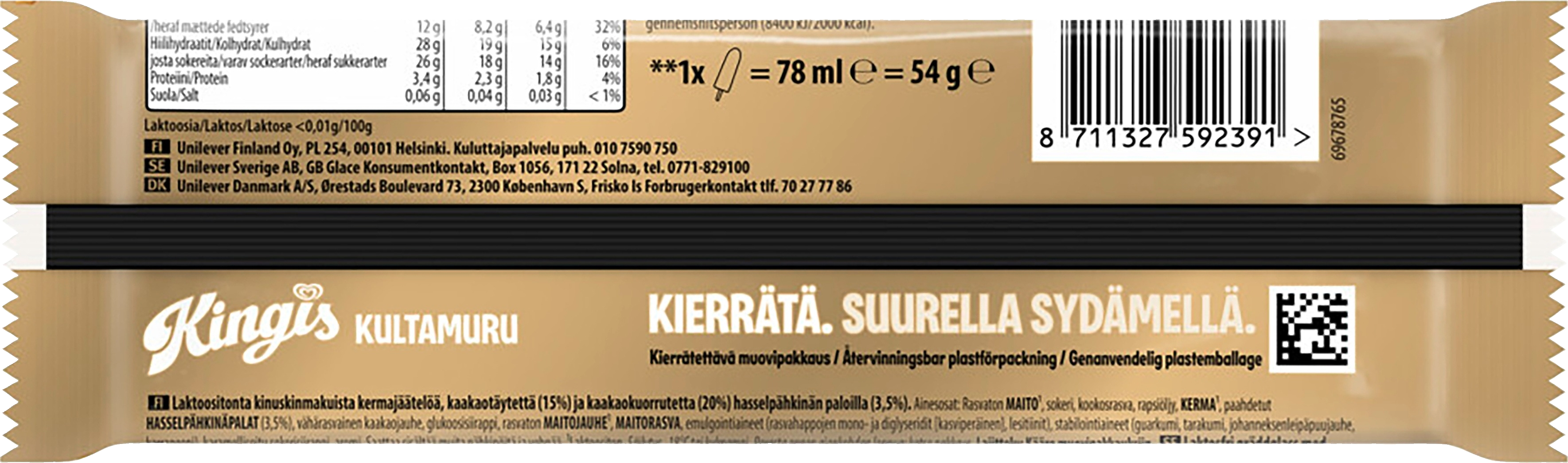Kingis - suurella sydämellä. Rakastettu klassikkojäätelö Kingis on hurmannut jo yli 40-vuotta suomalaisia jäätelönsyöjiä suurella sydämellä. Kingis Original -jäätelöpuikko on takuuvarma valinta vuodesta toiseen ja lisäksi Kingis -jäätelöiden vaihtuvat uutuusmaut hurmaavat herkullisuudellaan. Puikkojäätelöiden lisäksi Kingis on laajentunut uusiin tuotemuotoihin ja voit nyt herkutella puikkojäätelön lisäksi Kingis-keksijäätelöllä ja jälkiruokajäätelöllä. Kingiksellä on suuri sydän ja pilke silmäkulmassa ja se haluaa kannustaa kaikkia suurisydämisiin tekoihin. Kingis on tehnyt useana vuonna yhteistyötä Pelastakaa Lapset ry:n kanssa ja vuonna 2022 Kingis on yksi Mielinauha -keräyksen pääyhteistyökumppaneista. Saattaa sisältää muita pähkinöitä ja vehnää.