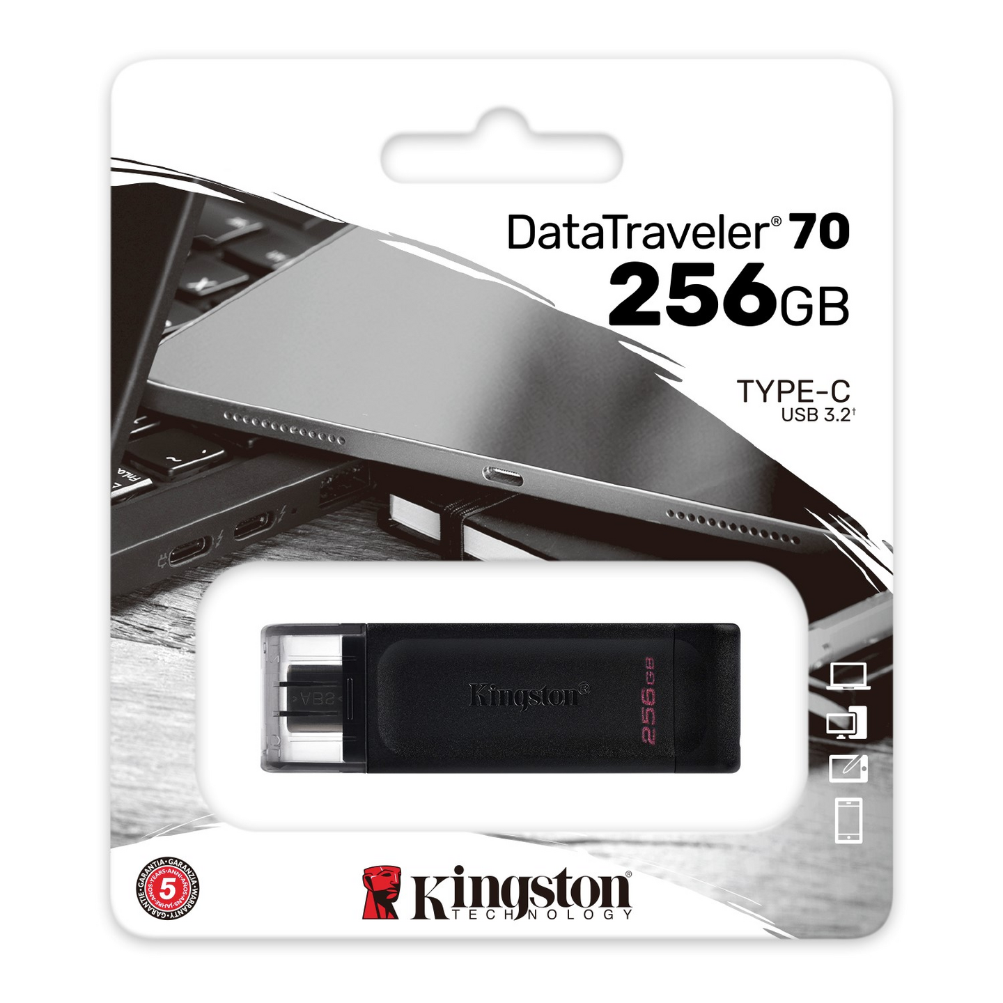 Kingstonin DataTraveler® 70 on kannettava, USB 3.2 Gen 1 yhteensopiva kevyt USB-C -flashmuistitikku. Se on suunniteltu sopimaan USB-C-laitteisiin, kuten kannettaviin tietokoneisiin, tabletteihin ja puhelimiin. 256 gigatavun kapasiteetillaan DataTraveler 70 on omiaan laajentamaan jokapäiväisessä toiminnassa tarvitsemaasi tallennustilaa. Sillä on 5 vuoden takuu ja ilmainen tekninen tuki.