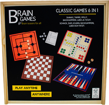 Kätevään laatikkoon pakattu pelisetti sisältää kuusi suosittua klassikkopeliä: shakki, tammi, mylly, backgammon, ludo ja yatzy. Peliohjeet suomeksi ja ruotsiksi. Ikäsuositus yli 6-vuotiaille.