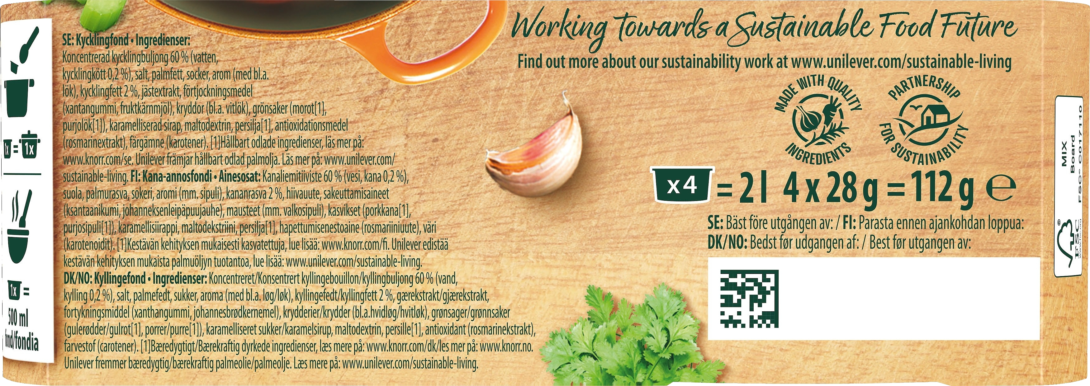 Knorr Fond ”du Chef” tiivistetty ja korkealaatuinen annosfondi, joka on valmistettu parhaista raaka-aineista. Voit valmistaa fondista liemen tai lisätä sen sellaisenaan ruokaan korostamaan ruoan luonnollisia makuja. Kokeile esimerkiksi kastikkeisiin, keittoihin ja pataruokiin sekä riisin tai pastan keitinveteen.