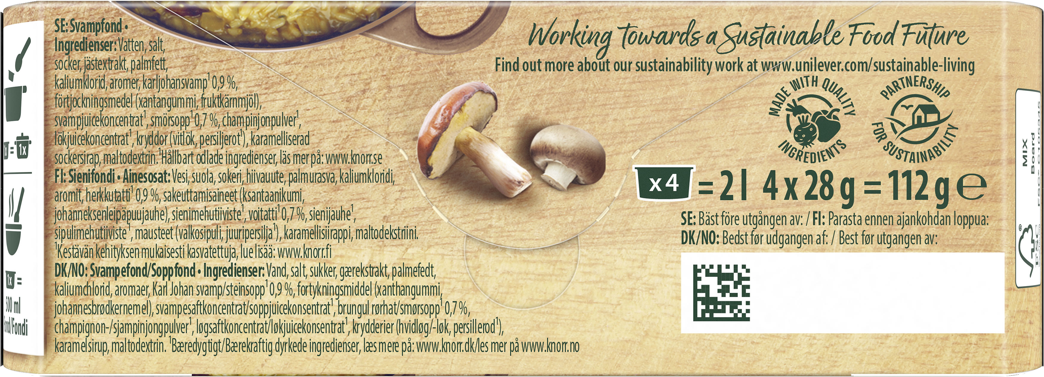 Knorrin fondit tuovat täyteläistä makua ruokaan! Nestemäisellä fondilla annostelet helposti oman makusi mukaan. Fondi sopii monipuolisesti käytettäväksi niin kastikkeissa, keitoissa, padoissa kuin esimerkiksi marinadina. Kokeile fondeja myös riisin tai pastan keitinveden maustajana. Knorr fondien nestemäisen muodon ansiosta tuote liukenee ruokaan välittömästi ja sillä voi maustaa entistä monipuolisemmin eri ruokia. Hemmottele makunystyröitäsi ja korosta valmistamasi ruoan luonnollista makua Knorr Fond du Chef sienen makuisella fondilla. Knorr Fond du Chef on tiivistetty ja korkealaatuinen annosfondi, joka on valmistettu parhaista raaka-aineista. Knorrin fondi on liemipohja, jonka täyteläinen maku syntyy hitaasti kypsytetyistä aineksista. Sienen makuinen annosfondi on heti käyttövalmis ja sopii erinomaisesti sienikastikkeisiin, sienikeittoon, sienipastaan, sienipiirakkaan tai vaikka risottoon. Voit käyttää Knorr sienen makuista fondia myös eri liharuokiin. Lisää annosfondi ruokaan valmistuksen yhteydessä. Voit myös liuottaa fondin kiehuvaan veteen. Käytä tällöin 500 ml kiehuvaa vettä. Jos haluat kevyemmän liemen, käytä 750 ml vettä. Maistuva liemi ja herkullinen ruoka on valmis muutamassa minuutissa. Knorrin fondit eivät sisällä keinotekoisia säilöntäaineita, eivät keinotekoisia väriaineita eikä niissä ole lisättyjä aromivahventeita, kuten natriumglutamaattia (MSG). Me rakastamme hyvää ruokaa ja ruoanlaittoa. Olemme tehneet Knorrilla vuosikymmenten ajan työtä korkealaatuisten ruokatuotteiden puolesta käyttäen parhaita raaka-aineita. Haluamme auttaa sinua valmistamaan hyvää, yksinkertaista ja terveellistä ruokaa, jossa on runsaasti makua. Johtotähtemme on intohimo laadukkaaseen ja maukkaaseen ruokaan. Se vie meidät tulevaisuuteen, joka huomioi paremmin yhteiskuntamme ja ympäristömme.