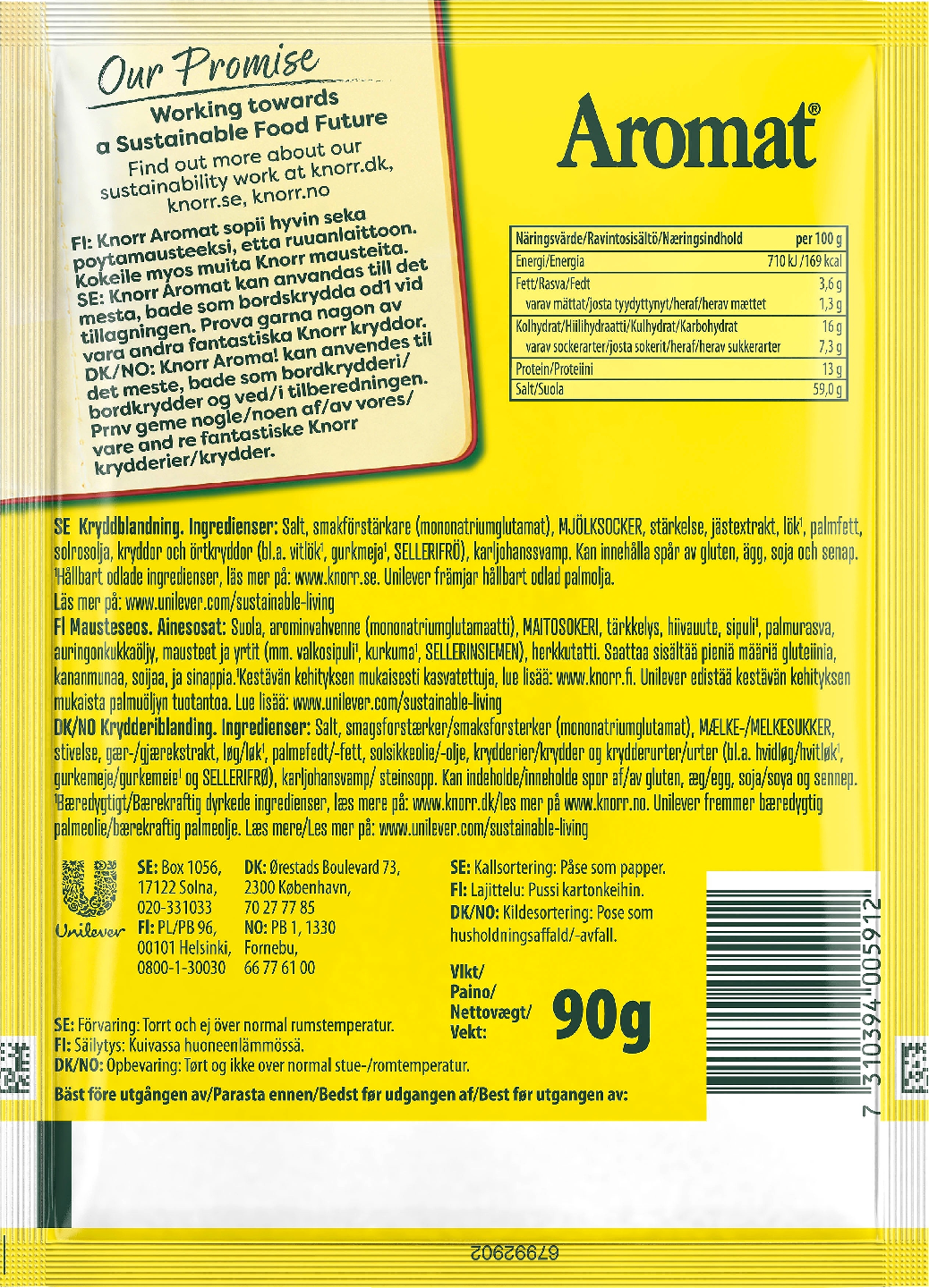 Knorr Aromat Maustesuola on yleismauste, joka tuo ruoan maun esille. Aromat sopii kaikenlaiseen ruoanvalmistukseen ja pöytämausteeksi. Knorr Aromat Maustesuola on monipuolinen mausteseos (90 g), jota voit käyttää useimpien ruokien mausteena – sekä valmistuksen yhteydessä että pöytämausteena. Knorr Aromat Maustesuola sisältää tasapainoisen yhdistelmän huolellisesti valittuja yrttejä ja mausteita, jotka tuovat esiin aterioiden parhaat puolet. Täynnä makua, nopea ja helppokäyttöinen. Kun teet ruokaa, käytä Knorr Aromisuolaa yhtä vaivattomasti kuin suolaa ja pippuria. Ruokaillessa aromisuola toimii mainiona pöytämausteena, josta jokaisen on helppo lisätä makua omaan annokseensa. Knorr Aromat Maustesuola sopii erinomaisesti liharuokiin, kalalle, kastikkeisiin, vihanneksiin, keittoihin ja lukuisiin muihin ruokiin. Aromisuola houkuttelee ruoka-ainesten hyvät maut esiin. Ripottele Knorr Aromat Maustesuolaa voileivälle tuorejuuston ja vihannesten kanssa – yksinkertaista ja herkullista. Mausta seiti, turska, lohi tai muu kalaruoka aromisuolalla, lisää hieman kermaa ja gratinoi uunissa. Yksinkertaista ja herkullista ruokaa, joka syntyy helposti. Haluatko kokeilla uutta makuyhdistelmää? Sekoita aromisuolaa hienonnettuun tuoreeseen rosmariiniin ja timjamiin, lisää vielä merisuolaa ja tilkka oliiviöljyä ja käytä lihan, kalan ja vihannesten mausteena. Knorr Aromat Maustesuolaa saat kätevässä purkissa (sirotin) – saatavilla on nyt myös täyttöpussi. Maustevalikoimaamme kuuluu myös Knorr Liha- ja grillausmausteseos, joka on valmistettu erityisesti paistetulle ja grillatulle lihalle. Uskomme, että hyvällä ruoalla on merkitystä ja että arjen ateriat voivat olla yhtä maagisia kuin juhlallisten tilaisuuksien kattaukset. Käytämme korkealaatuisia raaka-aineita luodaksemme ruokatuotteita, joita perheet arvostavat ympäri maailmaa.