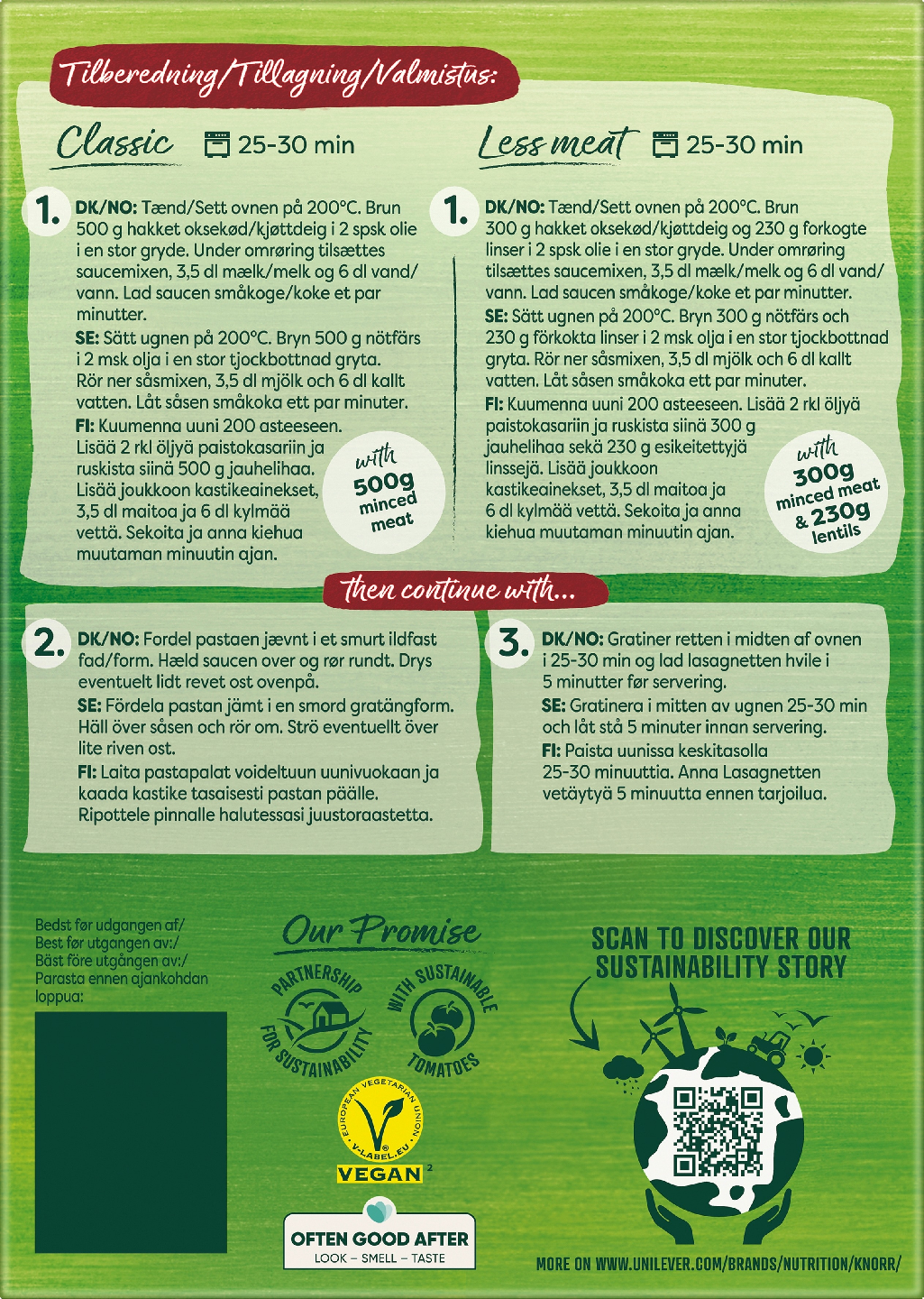 Knorr Lasagnette Ateria-aineksista valmistuu helppo miedonmakuinen ja herkullinen pastaruoka, joka on erityisesti perheen pienimpien mieleen. Knorr Ateria-aines Lasagnette -pakkaus sisältää kastikeainekset ja pastan, joten sinun tarvitsee lisätä vain jauheliha, maito ja juustoraaste. Yhdestä pakkauksesta saat 3–4 annosta Lasagnettea. Lasagnette on arvostettu lasagnen muunnelma, jossa pastapalaset ovat pienempiä ja pastan aaltoileva reuna antaa pastalle omanlaisensa koostumuksen ja ulkonäön. Knorr Lasagnette Ateria-ainekset on valmistettu perinteiseen tapaan durumvehnäjauhoista. Kastikesekoitus on maustettu muun muassa sipulilla, valkosipulilla, porkkanalla, yrteillä ja sitruunalla. Valmistukseen on käytetty vastuullisesti kasvatettuja tomaatteja. Kun haluat vaihtelua lasagnetteesi, käytä mielesi mukaan naudanjauhelihaa, lampaanjauhelihaa tai kanan- ja broilerinjauhelihaa. Valitse kasvisjauheliha, kun haluat nauttia kasvislasagnetesta. Knorr Lasagnette Ateria-ainekset on vaivaton vaihtoehto arjen ruokapöytään – kuin tehty lapsiperheille ja kätevä poimia kaupasta ostoskärryyn. Tarjoile vaikka tuoreen salaatin kanssa – valinta on sinun! Me Knorrilla haluamme uudistaa ruokailutottumuksia, mutta emme voi tehdä sitä yksin. Tule mukaan! Rakennetaan yhdessä vihreämpää tulevaisuutta. Vieraile verkkosivuillamme knorr.com/fi nähdäksesi tuotteemme ja reseptimme. Tutustu kaikkeen siihen, mikä meitä inspiroi yhteisen kestävän tulevaisuuden luomiseen.