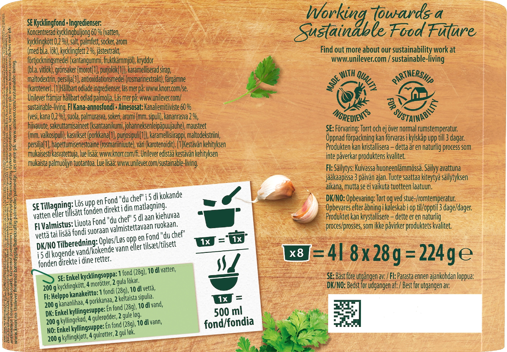 Knorr Fond ”du Chef” on tiivistetty, korkealaatuinen annosfondi, joka on valmistettu parhaista raaka-aineista. Voit valmistaa fondista liemen tai lisätä sen suoraan ruokaan korostamaan ruoan luonnollisia makuja. Fond "Du Chef" -kanafondi on käyttövalmis annos, joten sinun ei tarvitse annostella fondin määrää. Täyteläinen maku hitaasti haudutettuna. Keittiössä kaikki on valmiina – ainekset odottavat vain kypsentämistä. Tänään tehdään kanaruokaa. Apunasi on maukas liemi, täyteläinen ja herkullinen Knorr Fond "Du Chef" -kanafondi. Knorr Fond ”du Chef” -fondit maistuvat aidon liemen tavoin täyteläiseltä. Knorr Fond ”du Chef” on valmistettu huolella valituista raaka-aineista. Korkealaatuinen Fondi liukenee helposti kiehuvaan veteen muodostaen maukkaan liemen. Niin hyvää ja täydellistä – aivan kuin olisit tehnyt sen kokonaan itse. Ei lisättyjä arominvahventeita, ei säilöntäaineita tai keinotekoisia väriaineita. 100% luonnollisia ainesosia. Fond "du Chef" Chicken -kana-annosfondi tuo täyteläistä makua monenlaisiin kanaruokiin. Se on omiaan esimerkiksi vihannesten, pastan ja riisin kanssa. Kokeile kanafondia myös piirakoiden ja marinadien kanssa. Liuotat vain fondin kiehuvaan veteen tai lisäät suoraan ruokaan valmistuksen yhteydessä. Yksinkertaista, helppoa ja maukasta. Kahdeksasta Knorr Fond "Du Chefistä” saat neljä litraa fondia. Knorr Fond "du Chef" -annosfondeissa löytyy niin kana-, kala-, liha- kuin kasvisvaihtoehtoja. Me rakastamme hyvää ruokaa ja ruoanlaittoa. Olemme tehneet Knorrilla vuosikymmenten ajan työtä korkealaatuisten ruokatuotteiden puolesta käyttäen parhaita raaka-aineita. Haluamme auttaa sinua valmistamaan hyvää, yksinkertaista ja terveellistä ruokaa, jossa on runsaasti makua. Johtotähtemme on intohimo laadukkaaseen ja maukkaaseen ruokaan. Se vie meidät tulevaisuuteen, joka huomioi paremmin yhteiskuntamme ja ympäristömme. Tulevaisuuteen, jossa kaikki raaka-aineemme vihanneksista alkaen ovat kestävästi tuotettuja.