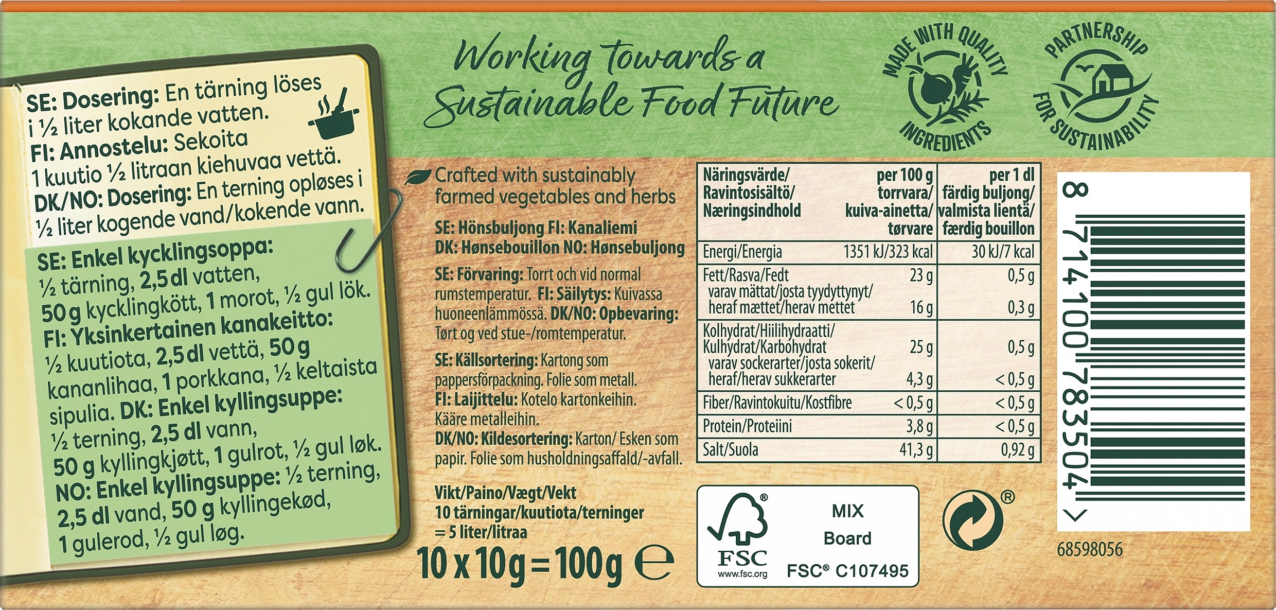 Knorr liemikuutiot tuovat täyteläisen maun ruokaan helposti. Lisää liemikuutio kastikkeeseen, keittoon tai pataruokaan – onnistut aina! Valitse oma suosikkisi, Knorr Liemikuutiot antavat makua jokaiselle aterialle. Täyteläinen maku ruokaan helposti. Annostelu: sekoita 1 kuutio ½ litraan kiehuvaa vettä. Ei lisättyä natriumglutamaattia. Vastuullisesti viljellyt kasvikset, yrtit ja mausteet. 100% luonnollisia ainesosia. Maukas kanaliemi antaa nopeasti ja helposti suosikkiruokaasi pyöreän, täyteläisen ja luonnollisen maun. Käytä Knorr Kanalientä pohjana erilaisille kanaruoille, ja mausta sillä esimerkiksi seuraava kanapata tai kanakeitto. Knorr Liemikuutio Kana on myös täydellinen vaihtoehto, kun haluat aasialaiseen wok-ruokaasi täyteläisyyttä. Suolan sijaan mausta riisi, pasta tai vihannekset keitettäessä kasvisliemellä. Knorr-kananliemi on MSG-vapaa. Saatavana 10 ja 20 kuution pakkauksissa. Me Knorrilla haluamme uudistaa ruokailutottumuksia, mutta emme voi tehdä sitä yksin. Rakennetaan yhdessä vihreämpää tulevaisuutta. Vieraile verkkosivuillamme knorr.com/fi nähdäksesi tuotteemme ja reseptimme. Tutustu kaikkeen siihen, mikä meitä inspiroi kestävän tulevaisuuden luomiseen.