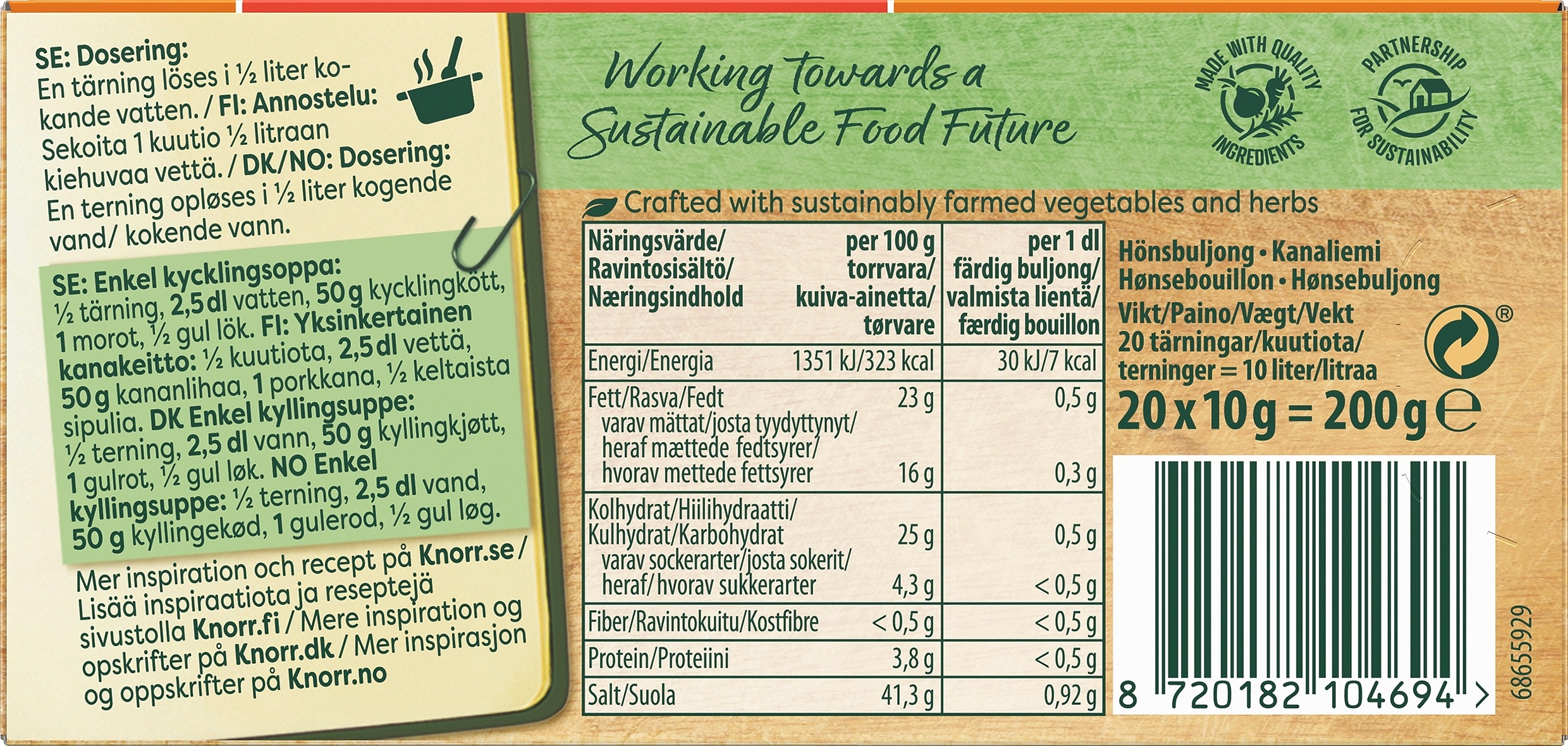 Knorr Liemikuutio Kana on loistava lisä erilaisiin perinteisiin ruokiin. Maukas kanaliemi, joka antaa nopeasti ja helposti suosikkiruoillesi pyöreän, täyteläisen ja luonnollisen maun. Nyt 20 kappaleen pakkauksessa! Käytä Knorr Kanalientä pohjana erilaisille kanaruoille, muhennoksille, keitoille, marinadeille ja kastikkeille nostaaksesi maut seuraavalle tasolle. Tai käytä sitä antamaan aasialaiselle wok-ruoalle täyteläisempi maku. Voit myös käyttää liemikuutiota suolan sijaan, kun keität riisiä, pastaa tai vihanneksia. Knorr Liemikuutio on MSG-vapaa. Annostelu: sekoita 1 kuutio puoleen litraan kiehuvaa vettä. Ei lisättyä natriumglutamaattia. Vastuullisesti viljellyt kasvikset, yrtit ja mausteet. 100 % luonnollisia ainesosia. Laadukas ja maukas ruoka on intohimomme Knorrilla! Siksi pyrimme aina kehittämään uusia jännittäviä ruokatuotteita, jotka tekevät ruokailukokemuksestasi erityisen maistuvan. Yksi vahvimmista puolistamme on laaja tuntemus erilaisista paikallisista ruokaperinteistä – huolimatta siitä, että olemme niin suuri kansainvälinen brändi. Olemme tehneet Knorrilla vuosikymmenten ajan työtä luodaksemme korkealaatuisia tuotteita, jotka valmistetaan parhaista raaka-aineista. Tämä siksi, että haluamme auttaa sinua valmistamaan hyvää, yksinkertaista ja terveellistä ruokaa, jossa on runsaasti makua. Rakkaus laadukkaaseen ja maukkaaseen ruokaan on johtotähtemme. Se vie meidät tulevaisuuteen, joka huomioi paremmin yhteiskuntamme ja ympäristömme. Tulevaisuuteen, jossa kaikki raaka-aineemme ovat kestävästi tuotettuja. Me Knorrilla haluamme uudistaa ruokailutottumuksia, mutta emme voi tehdä sitä yksin. Siksi kutsumme sinut mukaan. Rakennetaan yhdessä vihreämpää tulevaisuutta. Vieraile verkkosivuillamme knorr.com/fi nähdäksesi tuotteemme ja reseptimme. Tutustu kaikkeen siihen, mikä meitä inspiroi kestävän tulevaisuuden luomiseen.