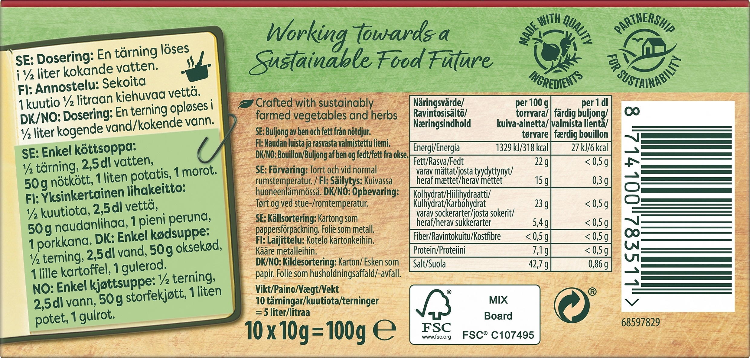 Käytä Knorr Liemikuutioita ruoanlaittoon. Ne tuovat täyteläisen maun ruokaan helposti. Lisää liemikuutio kastikkeeseen, keittoon tai pataruokaan – onnistut aina! Valitse oma suosikkisi, Knorr Liemikuutiot antavat makua jokaiselle aterialle. Annostelu: sekoita 1 kuutio ½ litraan kiehuvaa vettä. Ei lisättyä natriumglutamaattia eikä sokeria. Sisältää vastuullisesti viljeltyjä kasviksia, yrttejä ja mausteita. Kuinka voit saada aina haluamasi täyteläinen maun kokkaamaasi ruokaan – ja kaiken lisäksi pienellä vaivalla? Maukas Knorr Liemikuutio Liha antaa suosikkiruokillesi nopeasti ja helposti ihanan pyöreän, runsaan ja luonnollisen maun. Käytä Knorr Lihaliemikuutioita erilaisten pataruokien, keittojen lihamurekkeiden, jauhelihakastikkeen tai makkarastroganoffin pohjana. Knorr-lihaliemi on MSG-vapaa. Saatavana 10- ja 20-kuution pakkauksissa. Laadukas ja maukas ruoka on intohimomme Knorrilla! Siksi pyrimme aina kehittämään uusia jännittäviä ruokatuotteita, jotka tekevät ruokailukokemuksestasi erityisen maistuvan. Yksi vahvimmista puolistamme on laaja tuntemus paikallisista ruokaperinteistä – huolimatta siitä, että olemme niin suuri kansainvälinen brändi. Meitä ohjaa rakkaus ruokaan. Olemme tehneet Knorrilla vuosikymmenten ajan työtä luodaksemme korkealaatuisia tuotteita, jotka on valmistetaan parhaista raaka-aineista. Haluamme auttaa sinua valmistamaan hyvää, yksinkertaista ja terveellistä ruokaa, jossa on runsaasti makua. Juuri intohimomme laadukkaaseen ja maukkaaseen ruokaan on johtotähtemme. Se vie meidät tulevaisuuteen, joka huomioi paremmin yhteiskuntamme ja ympäristömme. Tulevaisuuteen, jossa kaikki raaka-aineemme vihanneksista alkaen ovat kestävästi tuotettuja. Me Knorrilla haluamme uudistaa ruokailutottumuksia, mutta emme voi tehdä sitä yksin. Rakennetaan yhdessä vihreämpää tulevaisuutta. Vieraile verkkosivuillamme knorr.com/fi nähdäksesi tuotteemme ja reseptimme. Tutustu kaikkeen siihen, mikä meitä inspiroi kestävän tulevaisuuden luomiseen.