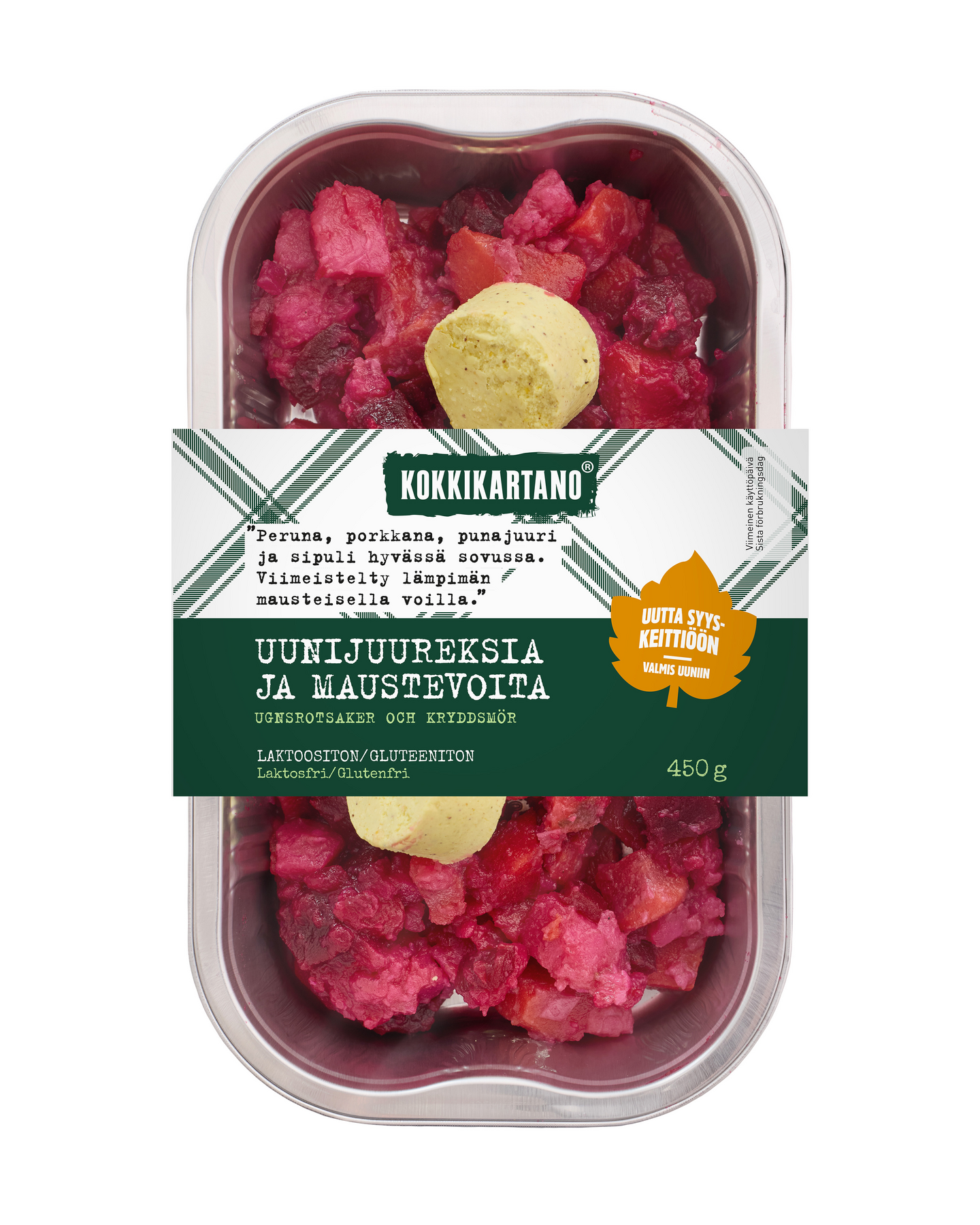 Tehtiin Kokkikartanolla täydellinen lohtupaketti syystalven pimeneviin iltoihin. Tässä maistuu kaikki sadonkorjuun maut. Lohkottiin perunaa, porkkanaa ja punajuurta sekä sipulia vuokaan ja viimeisteltiin maustevoilla, jossa maistuvat maailman maut ja joka lämmittää melkein sieluun asti. Lämmitä uunissa tai vaikka grillissä tai kasaa lautasella ja laita mikroon. Kyllä, myös vaikka airfrye käy.