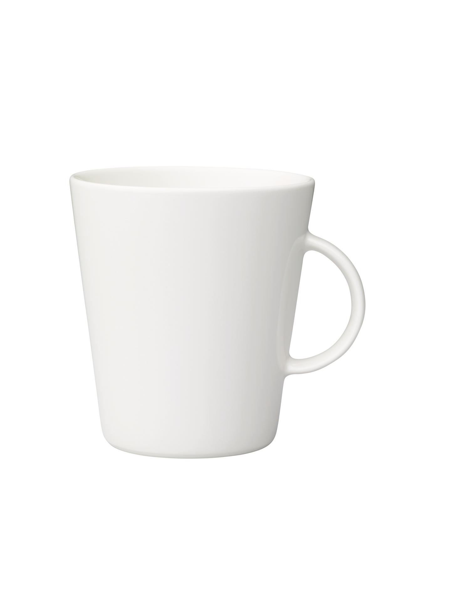 Arabia KoKo, moderni valkoinen iso muki 0,5L. Kristina Riskan ja Kati Tuominen-Niittylän KoKo-sarjan osat edustavat graafisessa minimalismissaan yhdistelyn vapautta houkuttelevin värein ja modernein muodoin. Astioiden väriskaala vaihtelee trendien mukaan.