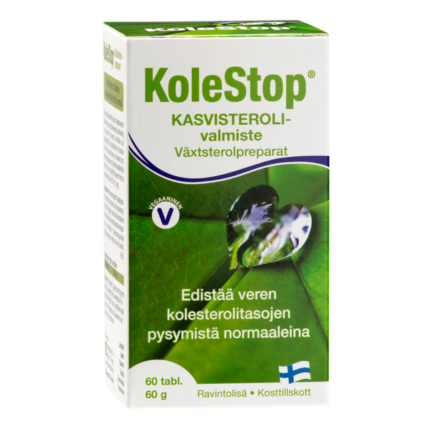 Kasvien sisältämät tärkeät kasvisterolit kuten beetasitosteroli poistuvat helposti ruoanvalmistuksessa. Kolestop sisältää vuorokausiannoksessa 2000 mg kasvisteroleja ja -stanoleja, jotka estävät kolesterolin imeytymistä ja edistävät siten veren kolesterolitasojen pysymistä normaalina. Suotuisa vaikutus saavutetaan nauttimalla kasvisteroleja/stanoleja päivittäin vähintään 800 mg. Annostus: 2 tablettia 2 kertaa päivässä nesteen kera. Ei sisällä eläinperäisiä ainesosia. Laktoositon, hiivaton, makeuttamaton ja gluteeniton. Valmistettu Suomessa.