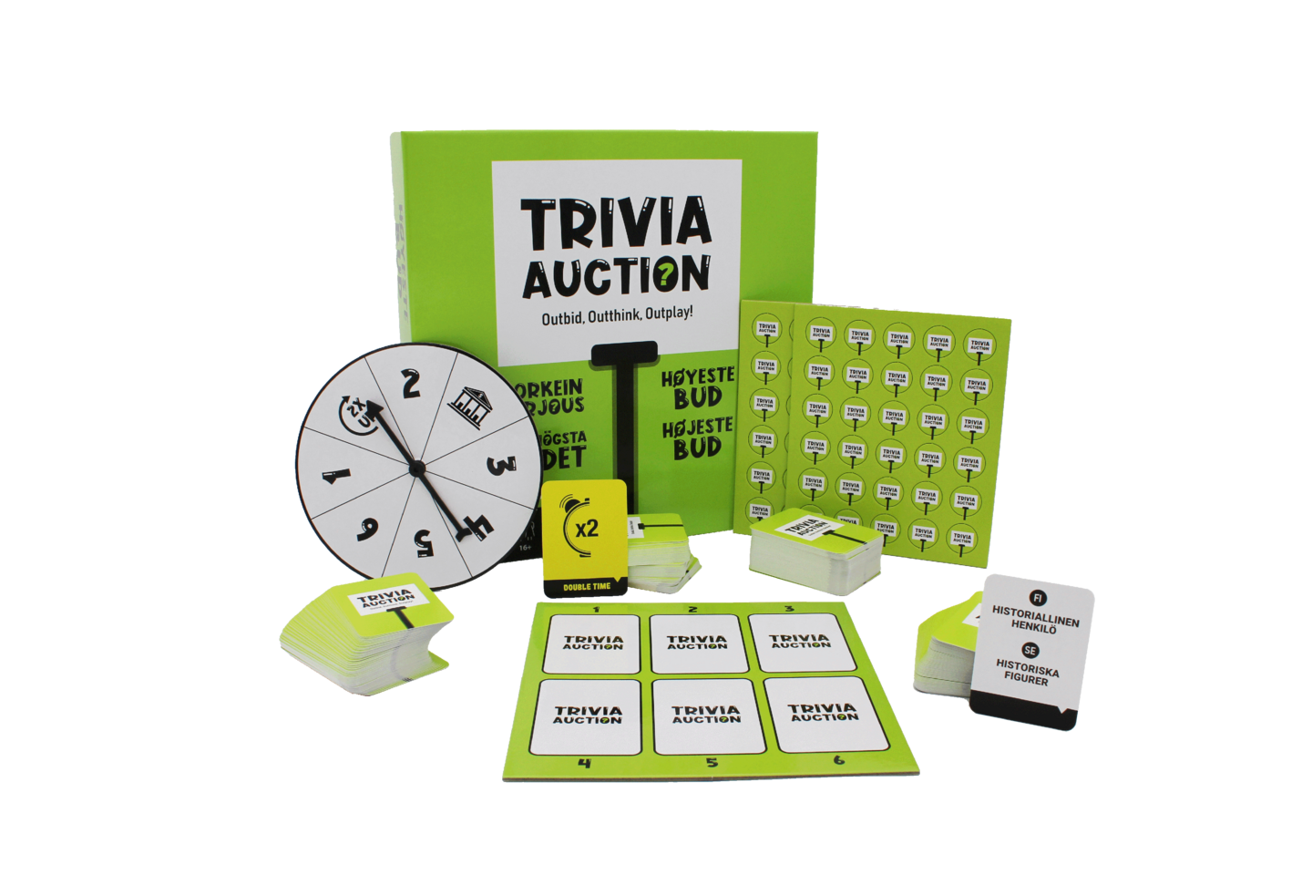 Hauska partypeli. Tee tarjous ja kerää 10 pelimerkkiä antamalla vastaukset kysymyskorttien aiheisiin. 2-6 pelaajalle 16-vuotiaista alkaen.