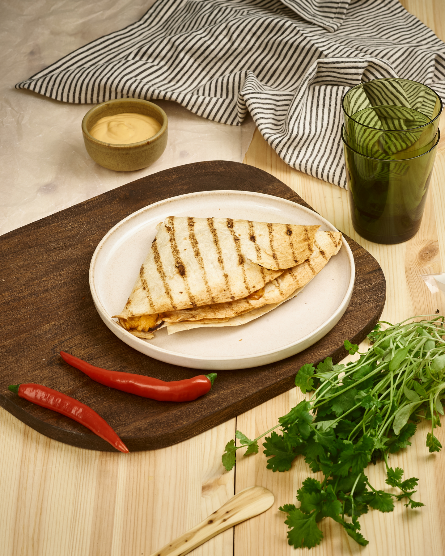 Suussa sulava quesadilla vie makunautinnon uusiin korkeuksiin. Täytämme tortilla-letun maukkaalla jauhelihatäytteellä, jonka maustamme chilillä, cayennepippurilla, punasipulilla sekä valkosipulilla. Koko komeus kruunataan chilimajoneesilla unohtamatta täytteeseen sulavaa juustoraastetta sekä raikasta tomaattia. Lämmitä quesadilla rapeaksi uunissa, parilalla tai grillissä. Tuote on vähälaktoosinen ja voimakassuolainen. Kruunu Herkku – käsin kokattua ruokaa Juvalta, raaka‐aineita rakastaen.