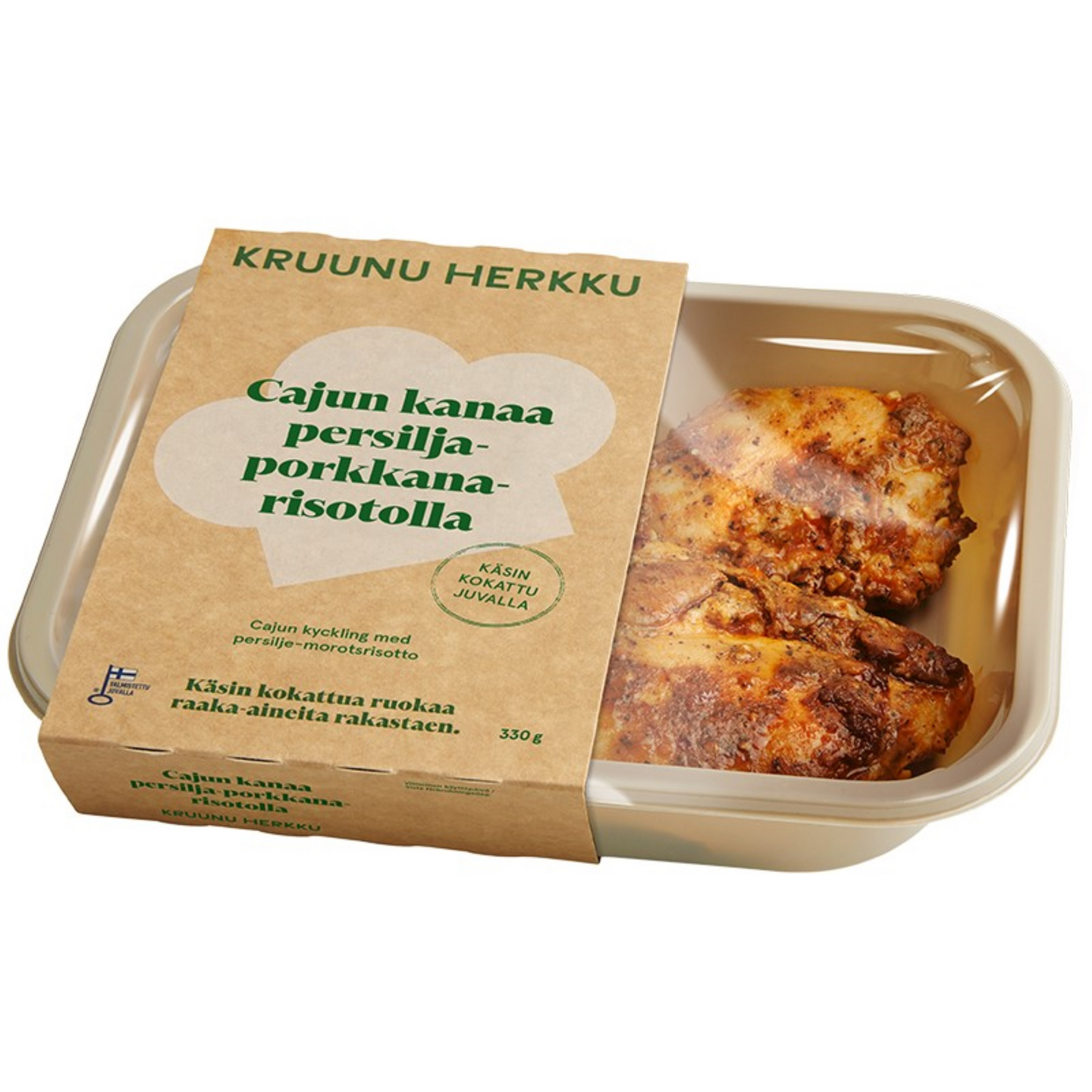 Kotimaista kanan cajun maustettua reisipalaa uunissa meheväksi paistettuna. Lisukkeena valkoviiniin keitettyä risottoa, johon on lisätty kotimaista porkkanaa ja ripaus persiljaa. Kruunu Herkku – käsin kokattua ruokaa Juvalta, raaka-aineita rakastaen.