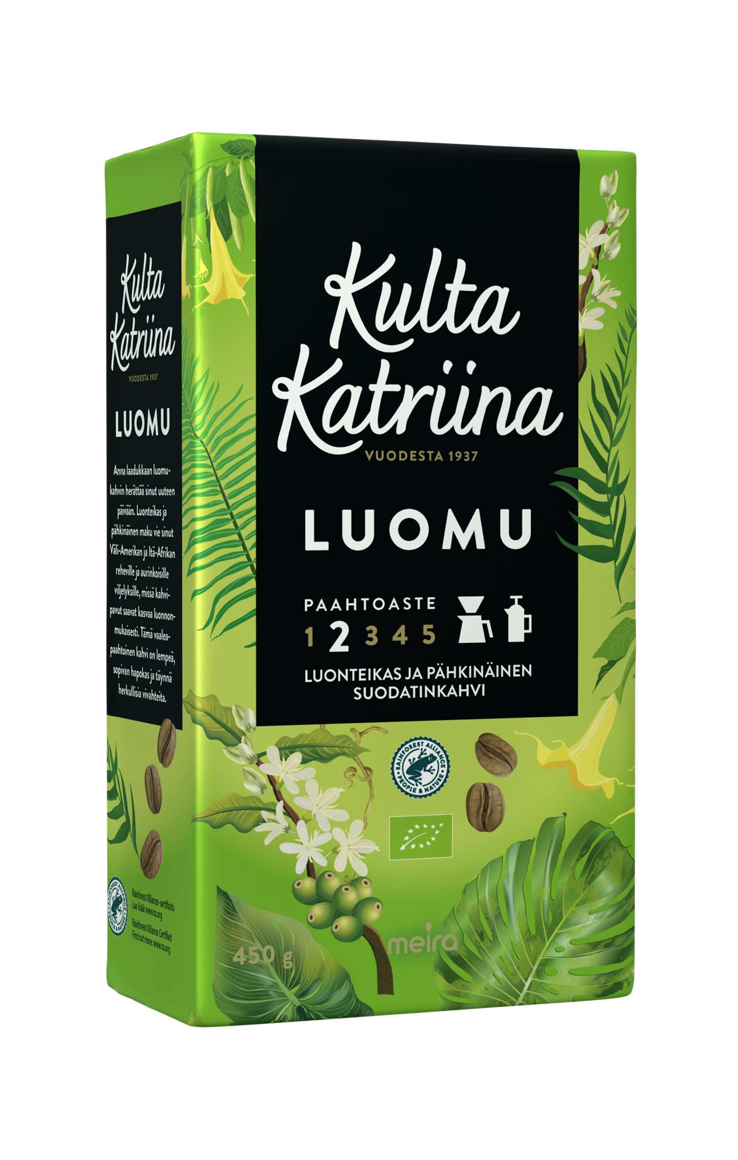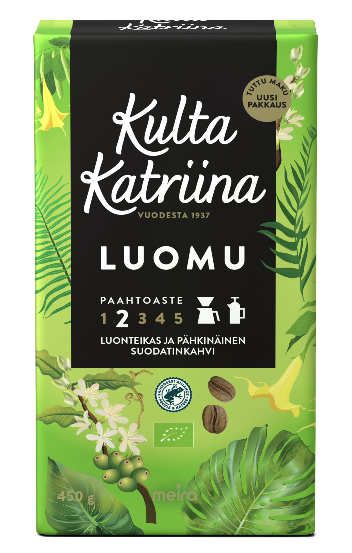 Kulta Katriina Luomu on luonnonmukaisesti tuotettu kahvi, jonka korkealaatuiset pavut saavat kypsyä ilman keinotekoisia lannoitteita Väli-Amerikassa ja Itä-Afrikassa. Kulta Katriina Luomu on maultaan luonteikas ja aavistuksen pähkinäinen. Tämä ryhdikäs kahvi on paahtoasteeltaan 2 eli vaalea.