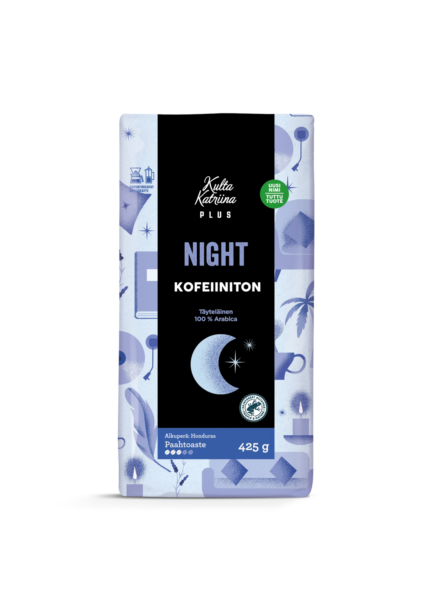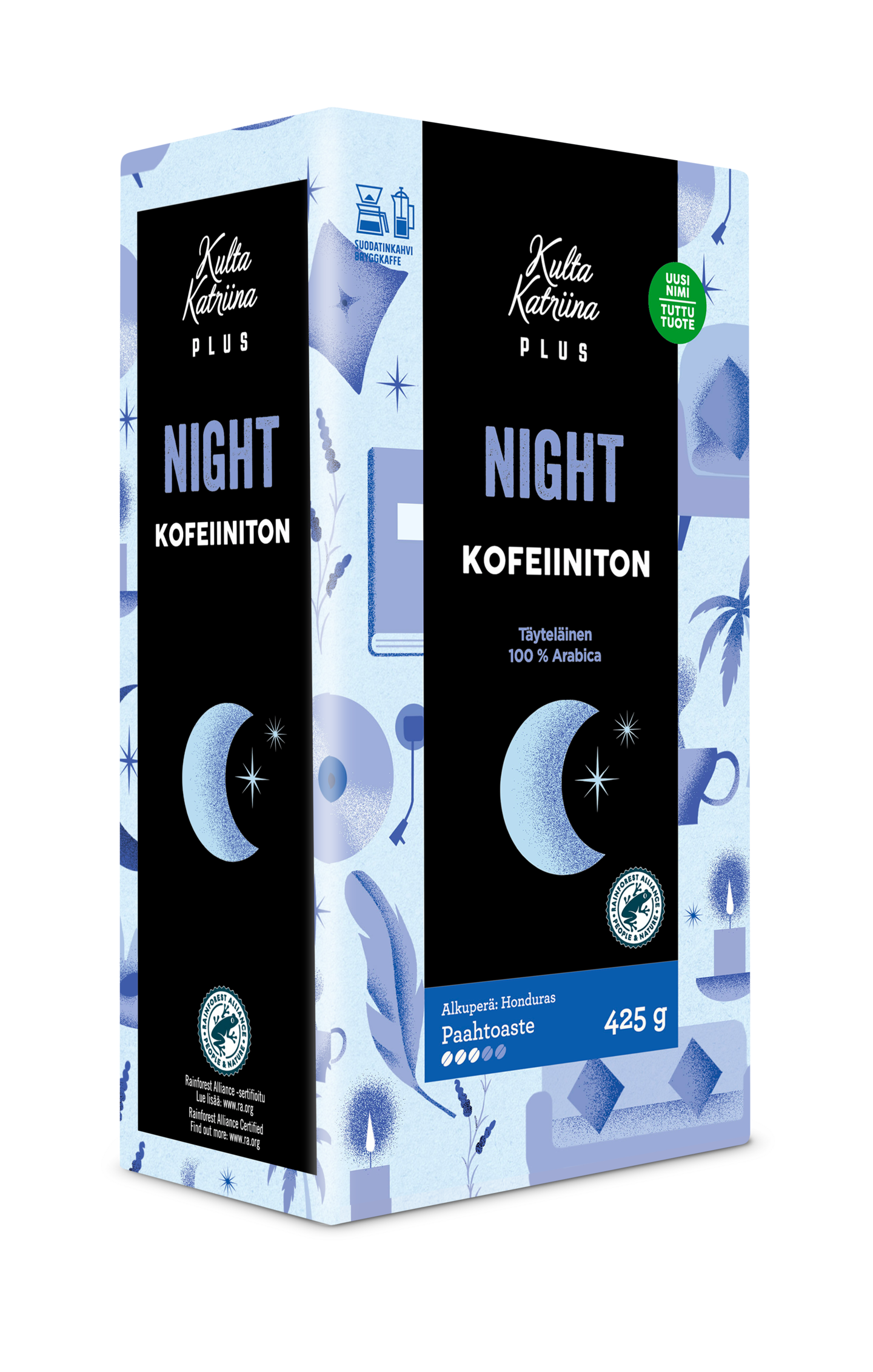 Kulta Katriina Plus Night on kofeiiniton, aromikas ja täyteläinen suodatinkahvi. Kahvilajikkeena on korkealaatuinen 100 % arabica-kahvi Rainforest Alliance -sertifioiduilta maatiloilta Hondurasista. Kahvin paahtoaste on tumma (3/5). Kofeiinitonta Kulta Katriina Plus Night -kahvia voit nauttia milloin vain. Kahvista on poistettu kofeiini luonnollisella vesimenetelmällä, jossa ei käytetä kemiallisia aineita. Kahvi on siis puhdasta nautittavaksi ja se maistuu aidolta kahvilta, vain kofeiini on luonnollisella tavalla poistettu.