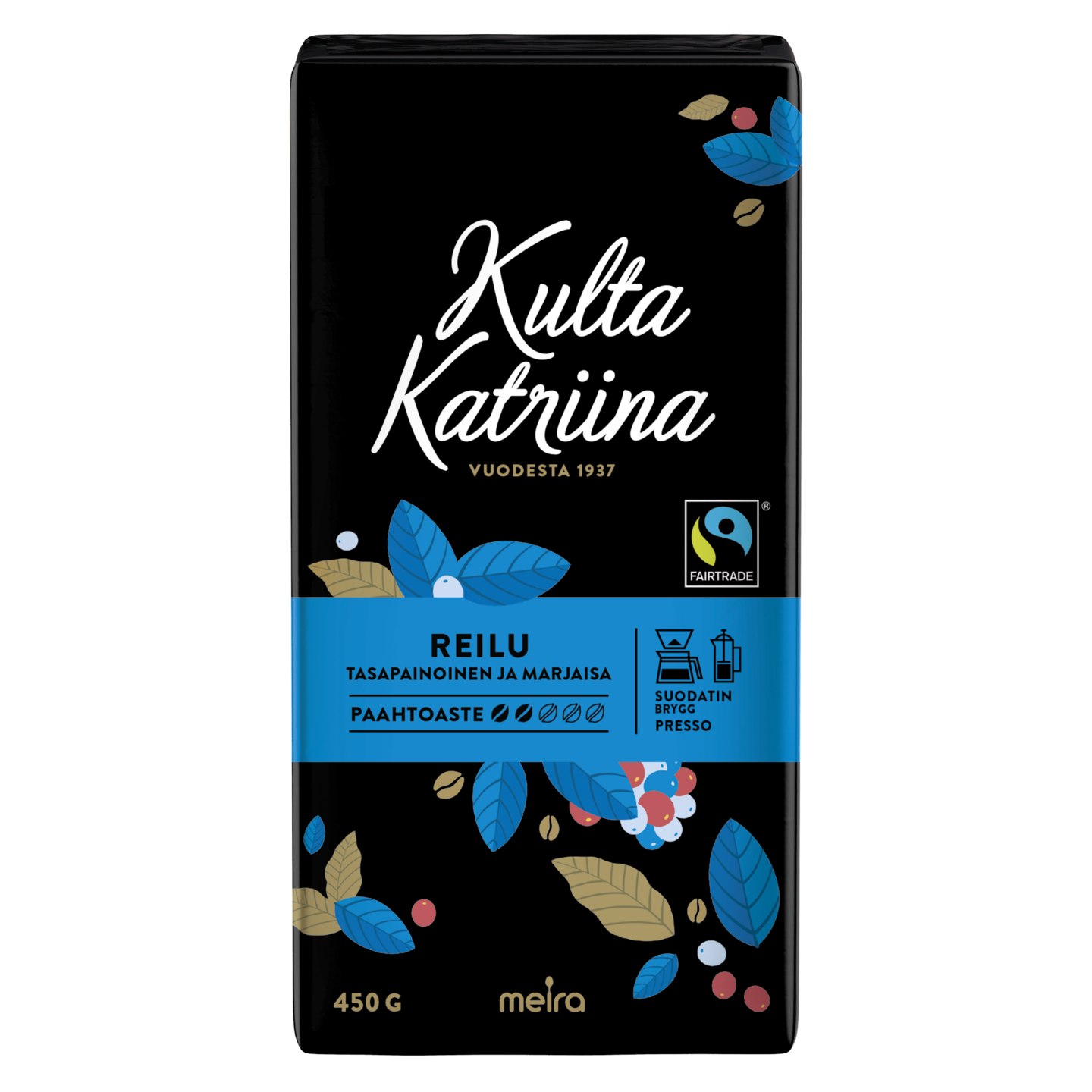 Kulta Katriina Reilu on korkealaatuinen Reilun kaupan kahvi, jonka runsas maku on peräisin Väli-Amerikan tarkkaan valikoiduista kahvipavuista. Tarkemmin ottaen pavut tulevat Reilun Kaupan sertifioiduilta tiloilta Kolumbiasta ja Hondurasista. Keskivaalea paahto (2) antaa kahville sopivaa hapokkuutta ja korostaa sen upean tasapainoista ja marjaisaa makua.