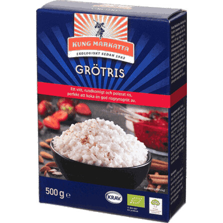 Kung Markattas ekologiska grötris kommer från Podalen i Italien där det får växa till sig i lugn och ro utan konstgödsel och bekämpningsmedel. Det blir ett härligt vitt, klibbigt ris som är perfekt att koka en god risgrynsgröt av. Ska ni jaga mandeln i gröten till jul så rekommenderar vi gärna våra sötmandlar (de är jättegoda utan gröt också.)