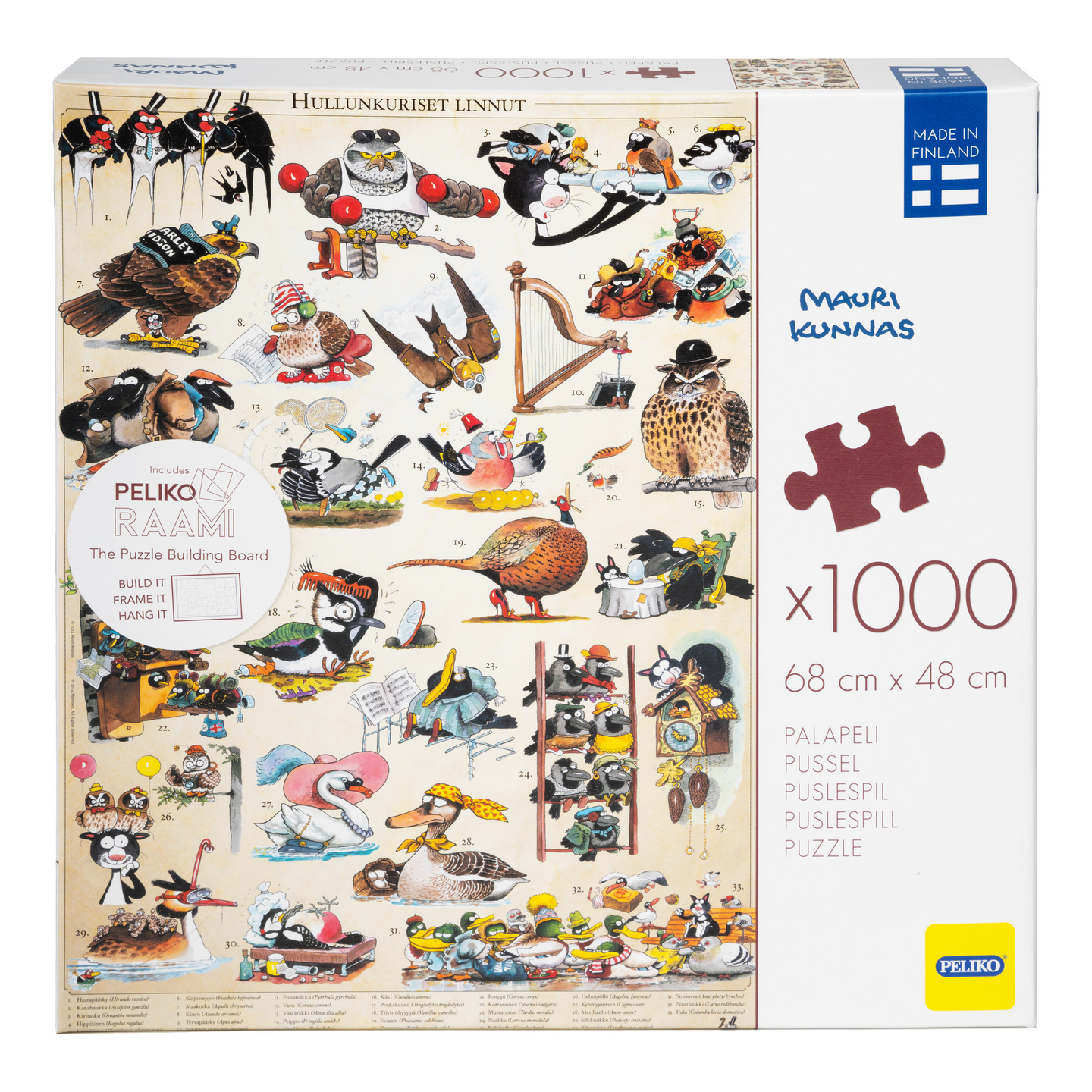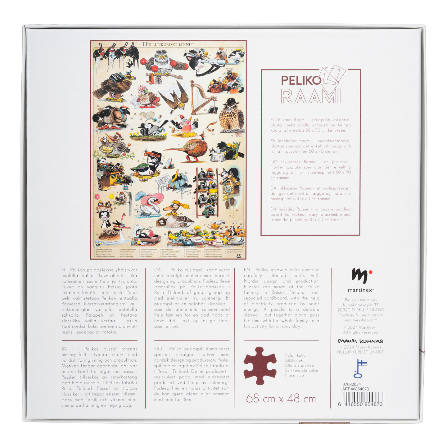 Punatulkut metsätöissä, painoja nosteleva kanahaukka, epäilyttävän suuri käen poikanen sekä päänsärystä kärsivä käpytikka. Nämä ja monta muuta hassunhauskaa lintua löydät 1000 palan palapelin kuvituksesta, joka on peräisin Mauri Kunnaksen ja Reijo Ikävalkon Hullunkurisesta lintukirjasta. Valmiin palapelin koko on 68 x 48 cm. Valmistettu Suomessa kierrätyskartongista. Sisältää Peliko Raamiin – kokoamisalustan, jonka avulla palapeli on helppo koota ja kehystää mihin tahansa standardikokoiseen 50x70 cm kehykseen.