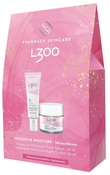 L300 Intensive Moisture lahjapakkaus sisältää Intensive Moisture Face Serum kasvoseerumin 30 ml, Intensive Moisture Night Cream yövoiteen 50 ml. Intensive Moisture Face Serum on karbamidia ja hyaluronihappoa sisältävä kasvoseerumi, joka tasoittaa ohuita juonteita ja tekee ihosta pehmeän. Intensive Moisture Night Cream yövoide ravitsee ihoa ja tekee siitä pehmeän ja joustavan. Voide sisältää ihon omia kosteuttavia aineita, karbamidia, suolaa ja maitohappoa sekä keramideja, jotka auttavat ihoa palauttamaan luontaisen suojakerroksensa. Kaikki tuotteet ovat hajusteettomia, dermatologisesti testattuja eivätkä sisällä eläinperäisiä raaka-aineita.