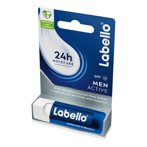 Unohda kuivat huulet Labello® Active for Menillä. Huulivoide sisältää suojakertoimen 15 ja suojaa huuliasi kylmältä, tuulelta ja kuivalta ilmalta. UVA/UVB-suoja auttaa suojaamaan huuliasi auringon haitallisilta vaikutuksilta. Kosteuttaa huulia tehokkaasti 24 tuntia kosteutusta. Sisältää hoitavaa, vastuullisesti hankittua shea voita ja luonnollisia öljyjä. Ei sisällä mineraaliöljyä. Kliinisesti testattu ja dermatologisesti hyväksytty. 100% ilmastoneuraloitu tuote*. Kierrätettävä pakkaus. *Jäljelle jäävät C02-päästöt on kompensoitu sertifioitujen ilmastoprojektien avulla.