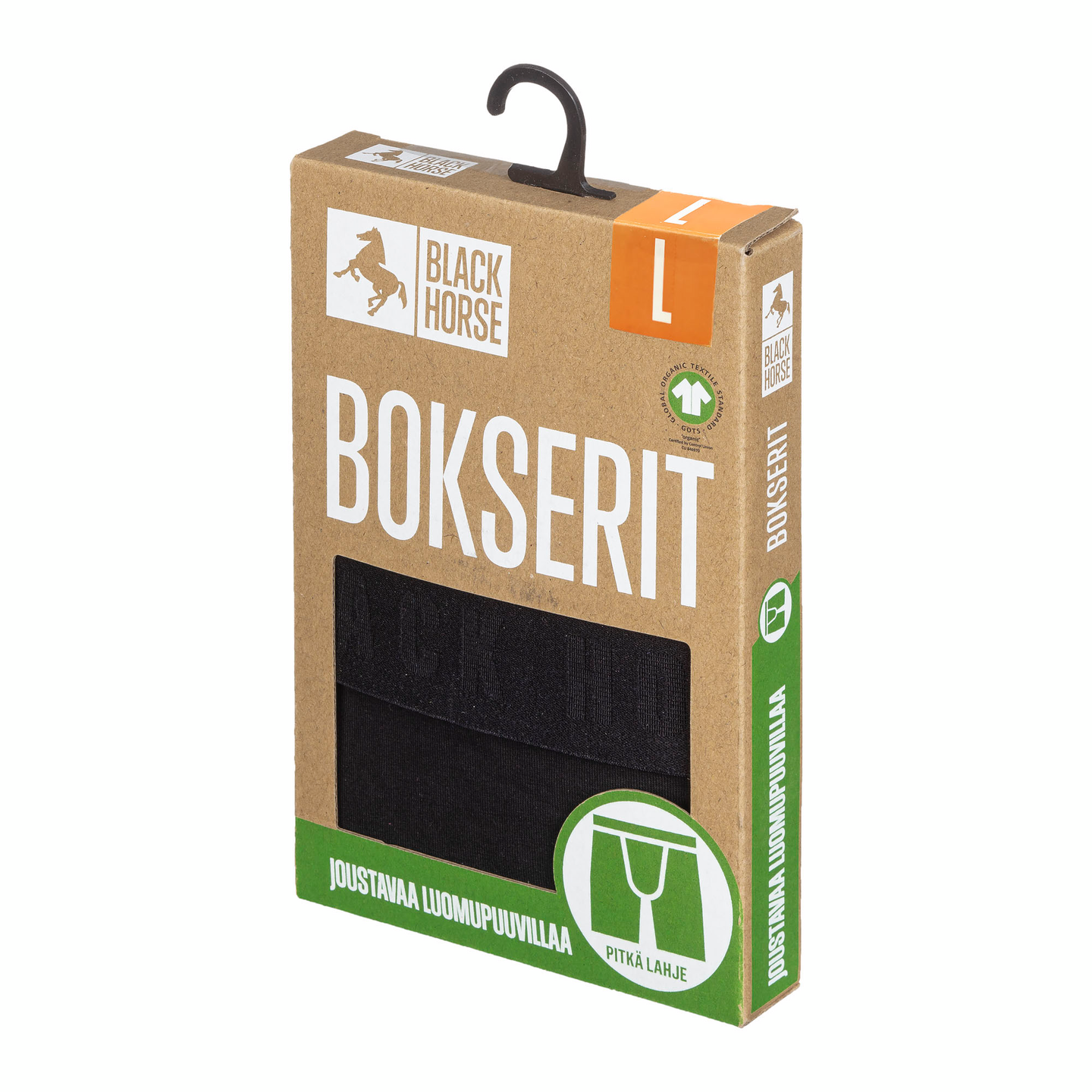 Black Horsen bokserit pidemmällä lahkeella. Materiaali on miellyttävän pehmeää luomupuuvillaa ja elastaania. Pidempi lahkeen pituus lisää käyttömukavuutta ja suojaa hiertymiltä. Ei kutittavia tai hiertäviä etikettejä - pesuohjeet painettu suoraan kankaalle. Leveä vyötärökuminauha ja kaksinkertainen etuosa. Aukoton malli. GOTS-sertifiointi takaa tuotteen ekologisuuden ja eettisyyden huomioiden koko tuotantoketjun.