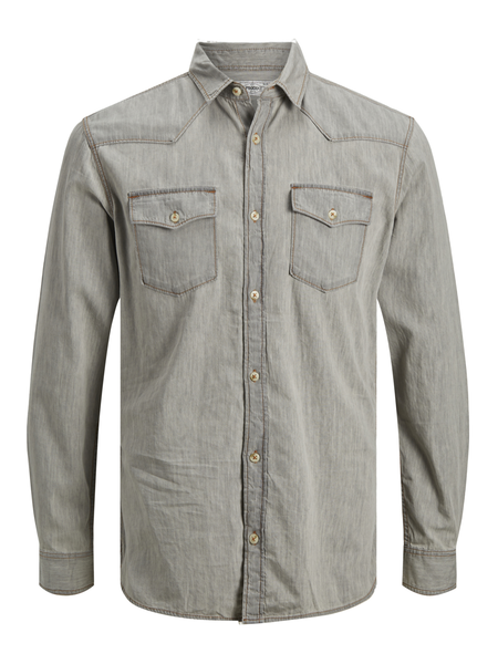 Miesten harmaa kauluspaita jossa napilliset taskut edessä.