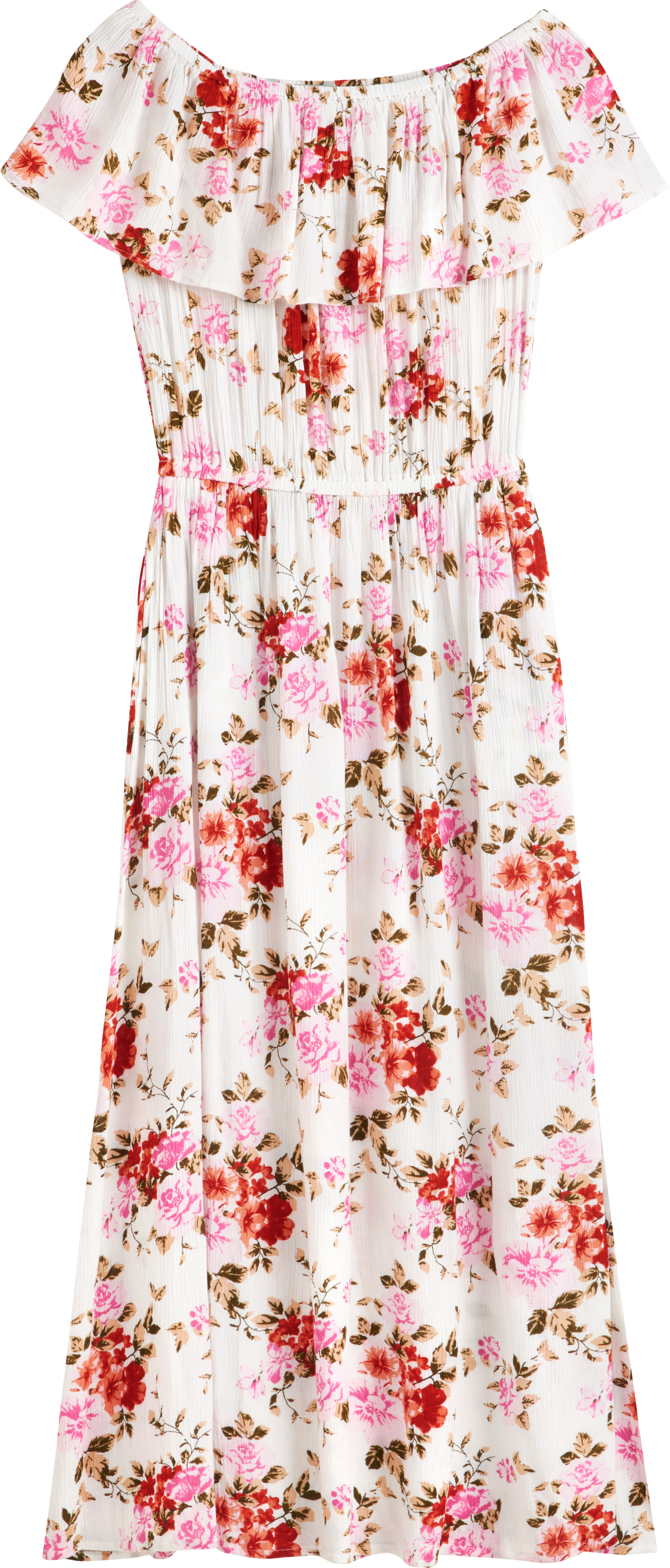 Pitkä frillakauluksinen ja -helmainen mekko. Kuminauha pääntie, jonka voi laskea olkapäille. Vyötäröllä kuminauha.