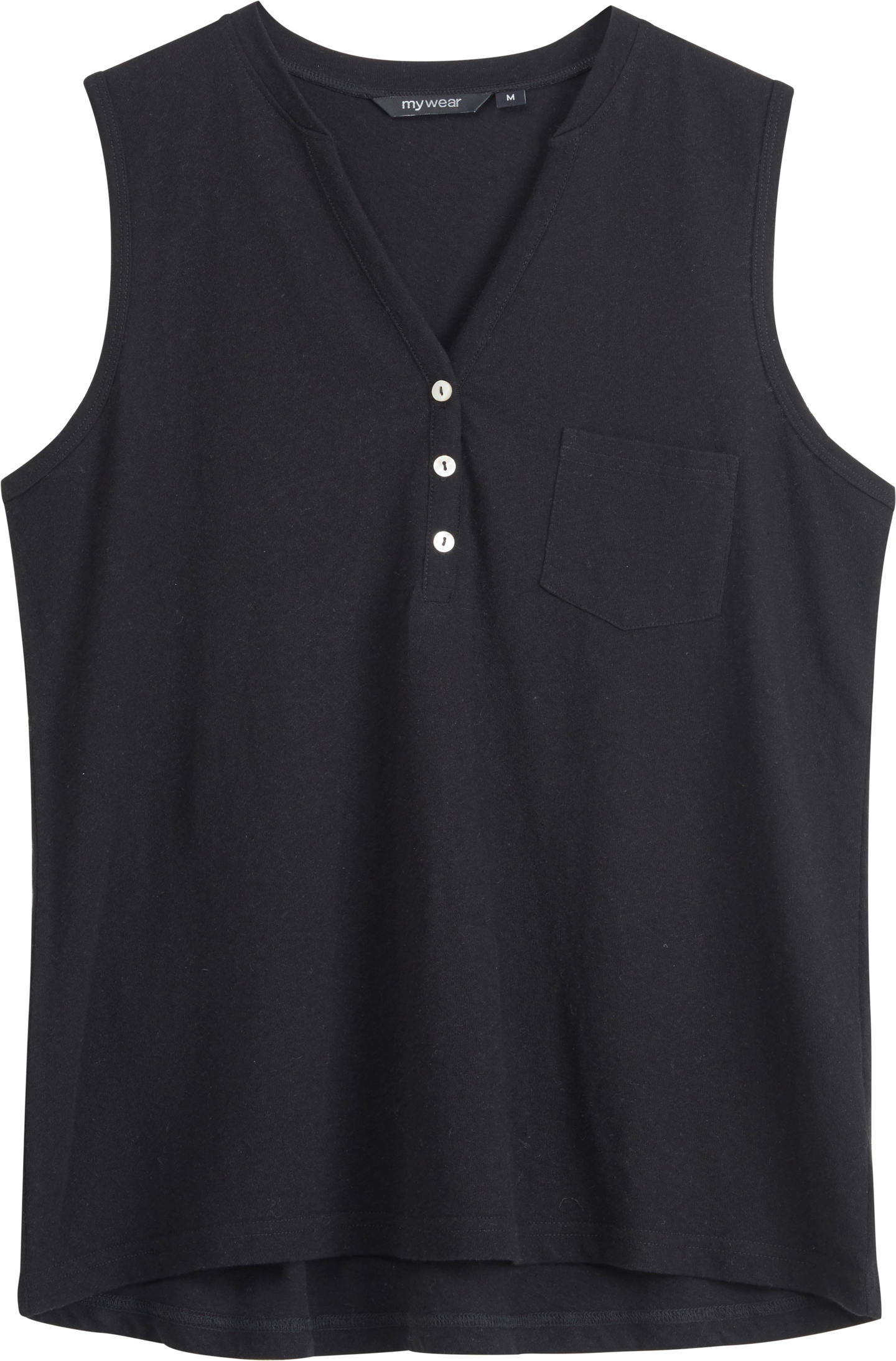 Hihaton trikootoppi. Nappilista edessä sekä pieni rintatasku. Suora malli.